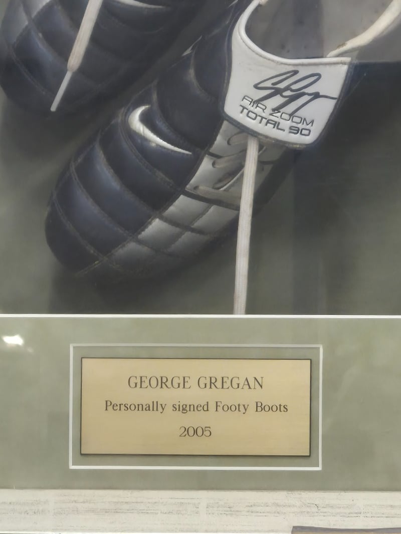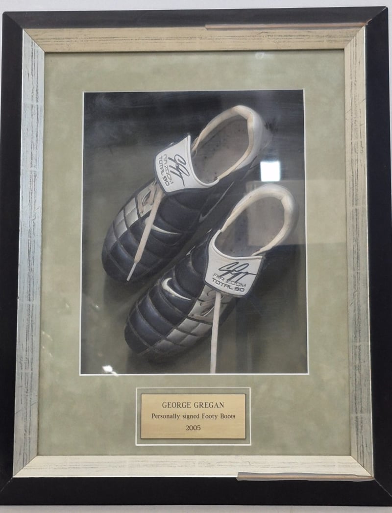 GEORGE GREGAN PERSONALLY SIGNED FOOTY BOOTS FRAMED DISPLAY, 2005