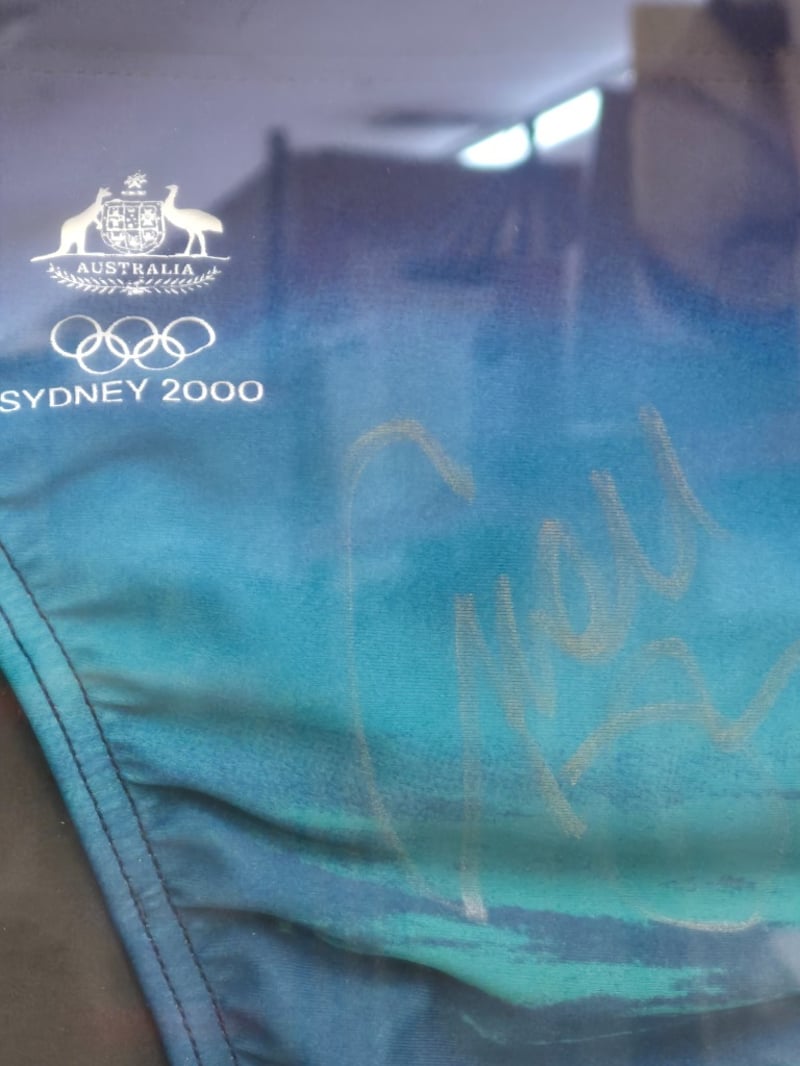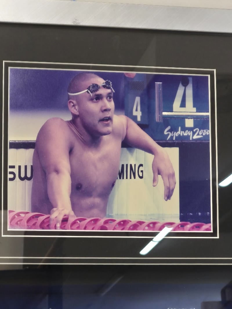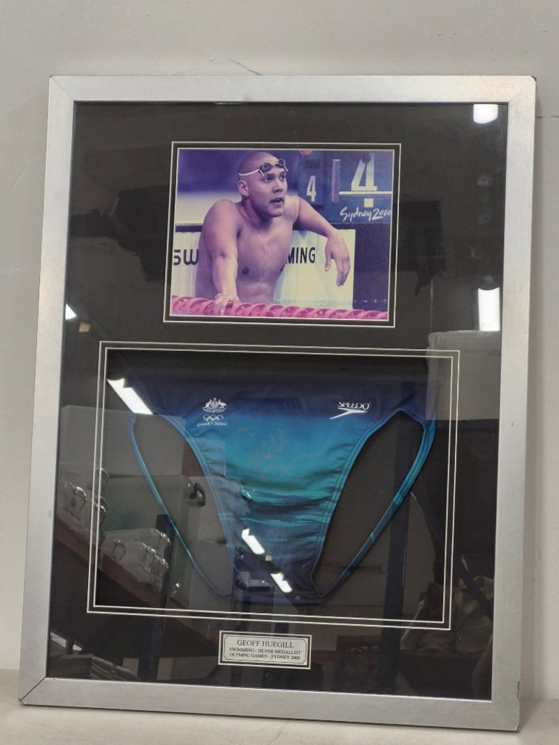 GEOFF HUEGILL SYDNEY 2000 OLYMPIC GAMES SWIMMING SILVER MEDALLST MEMORABILIA DISPLAY