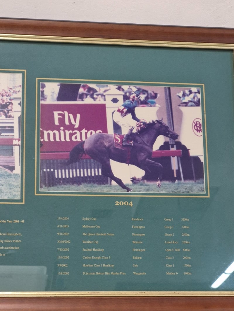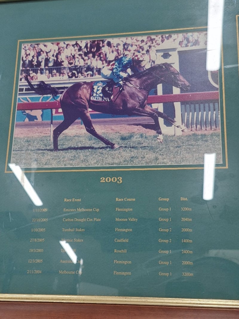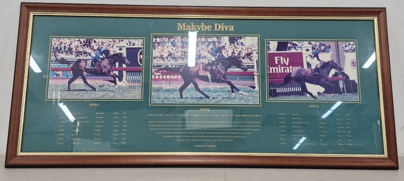 MAKYBE DIVA TRIPLE MELBOURNE CUP WINNER FRAMED COLLECTOR'S EDITIONItem Size: Height: 103cm, Width: 45cm, Depth: 3cmFramed Collector'S Edition Commemorating Makybe Diva, The Legendary Australian Racehorse. Features Three Colour Photographs From 2003, 2004, And 2005 Racing SeasonsCondition: Good - Refer To Images2B586369+11