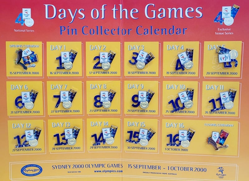 ASSORTED SYDNEY OLYMPICS 2000 PINS - INCLUDES DAYS OF THE GAMES CALENDAR PINS