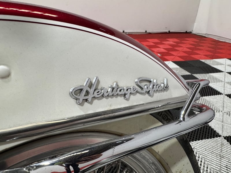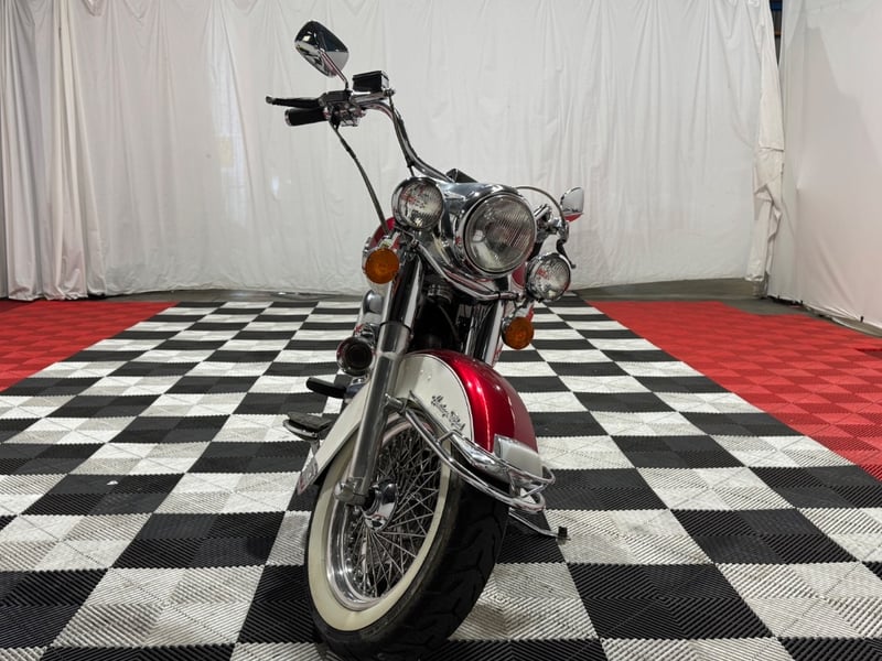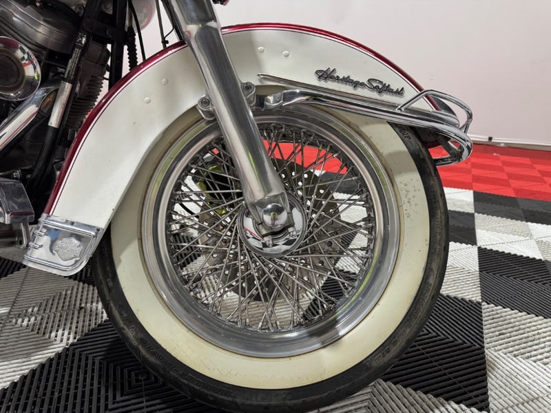 1988 Harley‑Davidson Heritage Softail finished in Red and White. Powered by a 1340cc (80 cubic inch) Evolution V‑Twin engine paired with a 5‑speed manual transmission. Odometer indicating 34,300 miles. Two‑seat configuration.