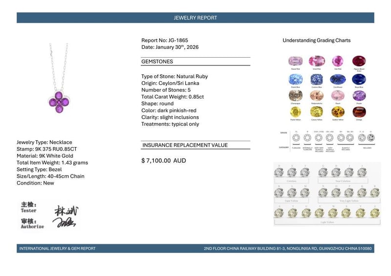 9CT WHITE GOLD CEYLON RUBY FLORAL PENDANT NECKLACE Featuring, 5 Round Cut, Dark Pinkish-Red Ceylon Rubies (0.85Ct Tsw, Slight Inclusions), Bezel Set. Chain Legnth Is Adjustable Between 40 And 45Cm. Valuations Provided by an Independent Third-Party Professional Not Directly Associated With Lloyds Auctions at AUD $7100This valuation has been conducted by an independent third-party professional. The valuation amount is an assessment by the issuing valuer and does not reflect the auction value of the item. Any inquiries regarding the valuation should be directed to the issuing valuer (refer to contact details on the certificate), as Lloyds Auctions has no affiliation or influence over the valuation, the valuer, or the stated amount. Condition: Good - Refer Images 0586399+1865