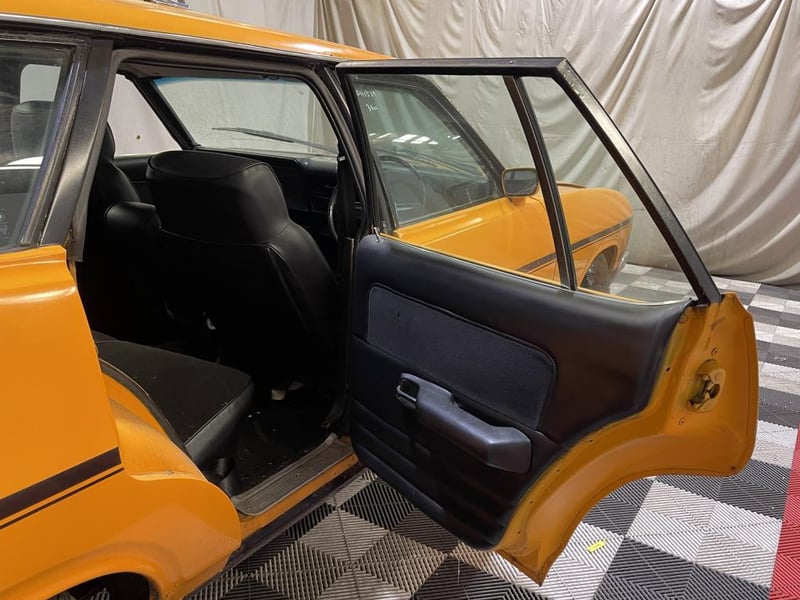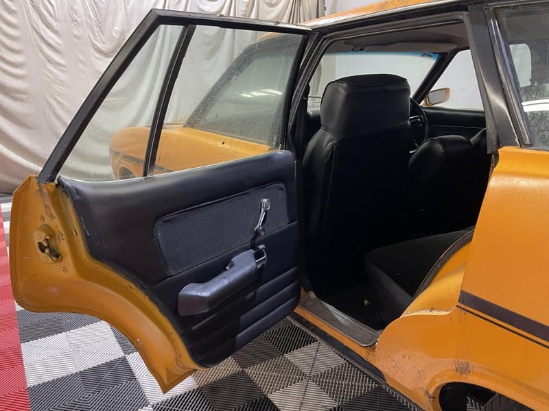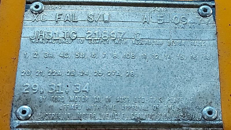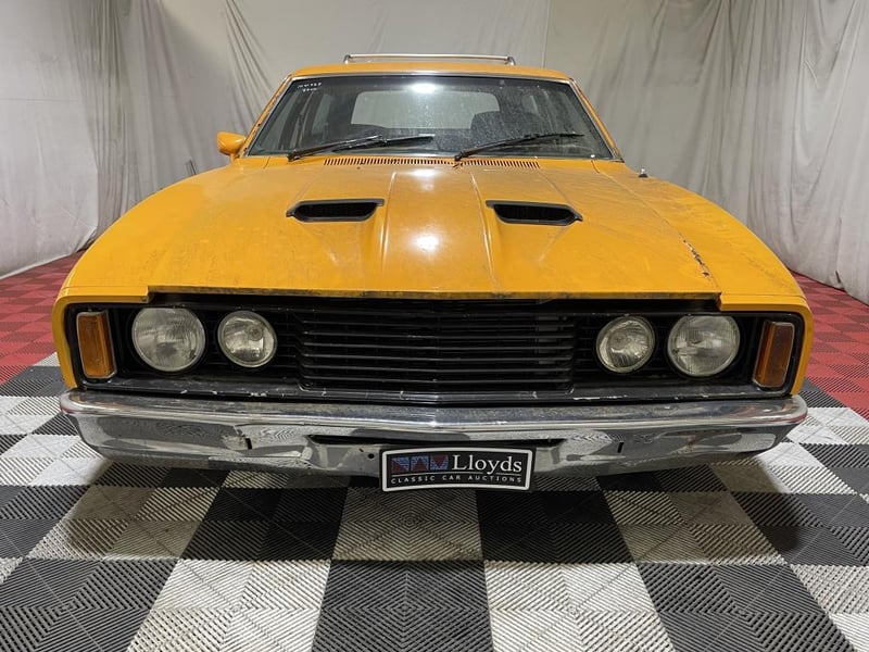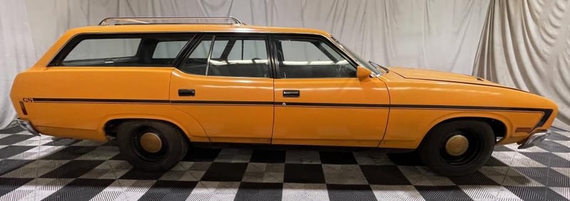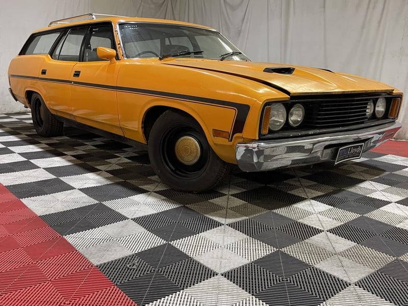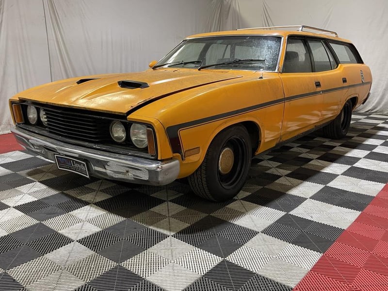 1977 Ford XC Falcon four‑door station wagon finished in orange. Rear‑wheel drive configuration powered by a 4.9 ‑litre V8 petrol engine paired with an automatic transmission. rust evident , Odometer indicating 175,591 kilometres.