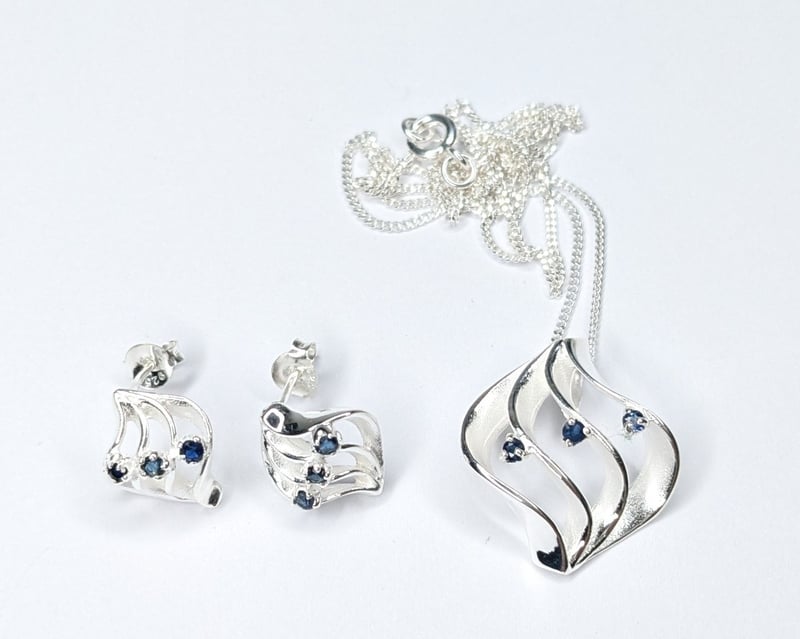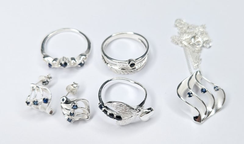 Sterling Silver Gemstone Sapphire Necklace, 3 Rings, Earrings And Pendant