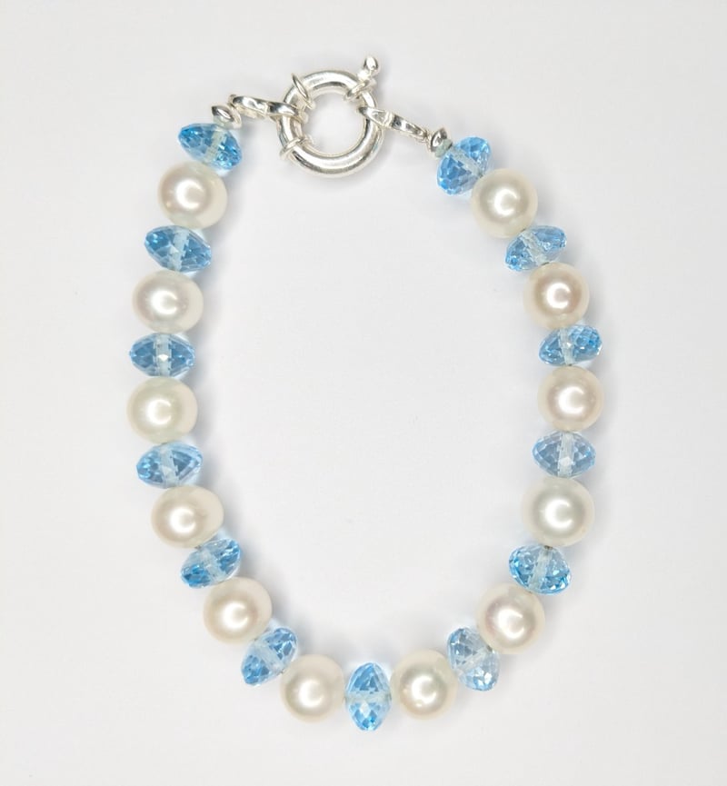 STERLING SILVER BLUE TOPAZ AND PEARL SET.Sterling Silver Pearl And Gemstone Bracelet, Sterling Silver Gemstone Pendant And EarringsTotal Item Weight: 25.41gDimensions: Height: 1.00mm, Width: 1.00mm, Depth: 1.00mmCondition: Good - Refer To ImagesInsurance Replacement Valuation Amount: $1,900.00FC163081+12