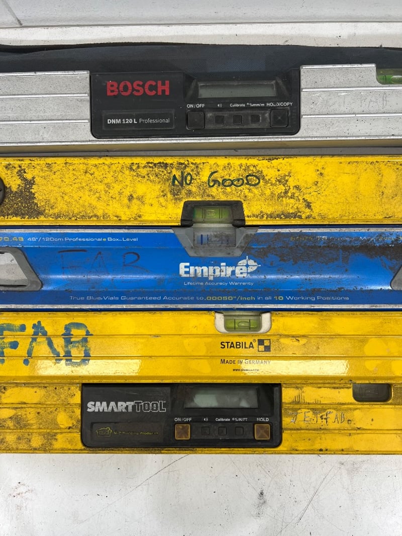 Spirit levels, brands include; smart tool, Stabila, Bosch etc, sizes include; 122cm, 120cm etc, manual and electronic types
