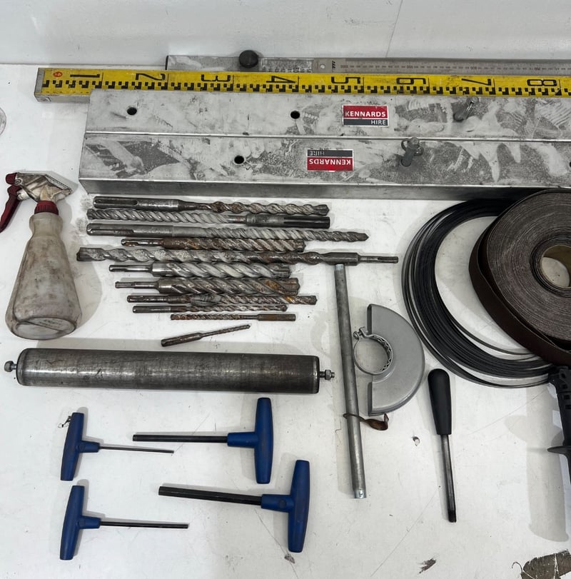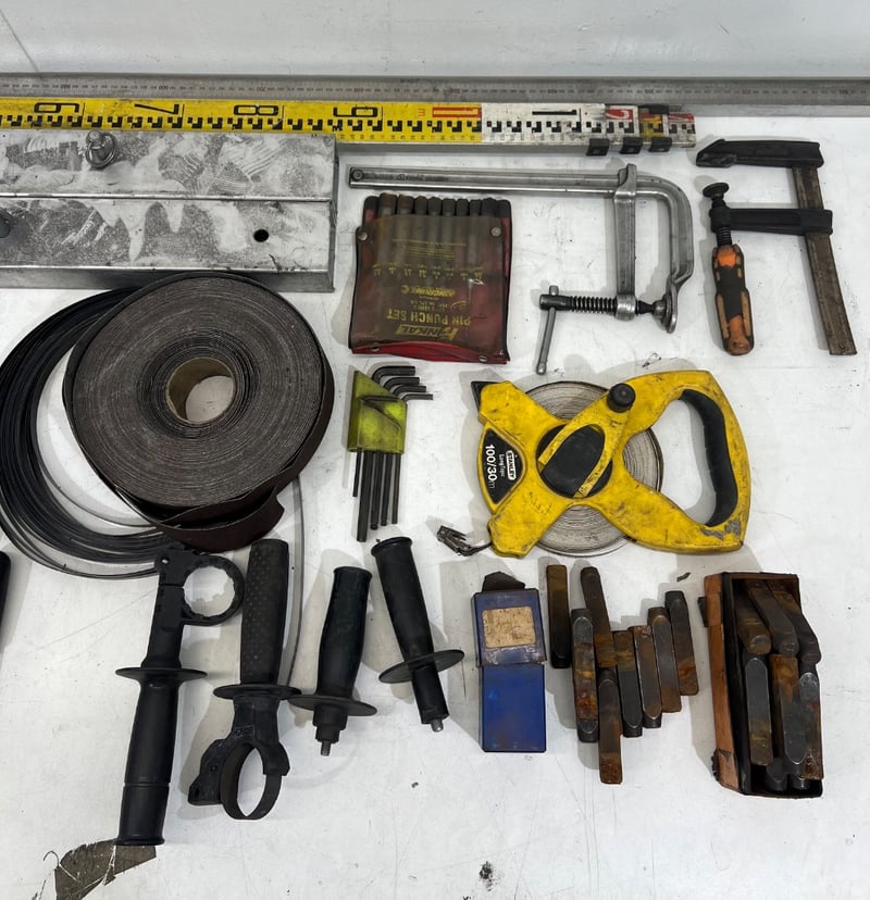 Assorted construction/ metal work tools, including; metal stamps, clamps, drill bits, measuring tools, sandpaper etc, assorted brand/ models