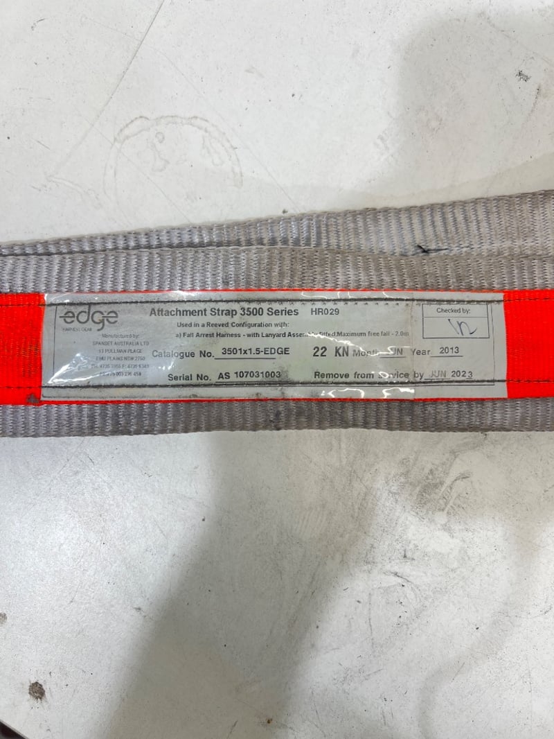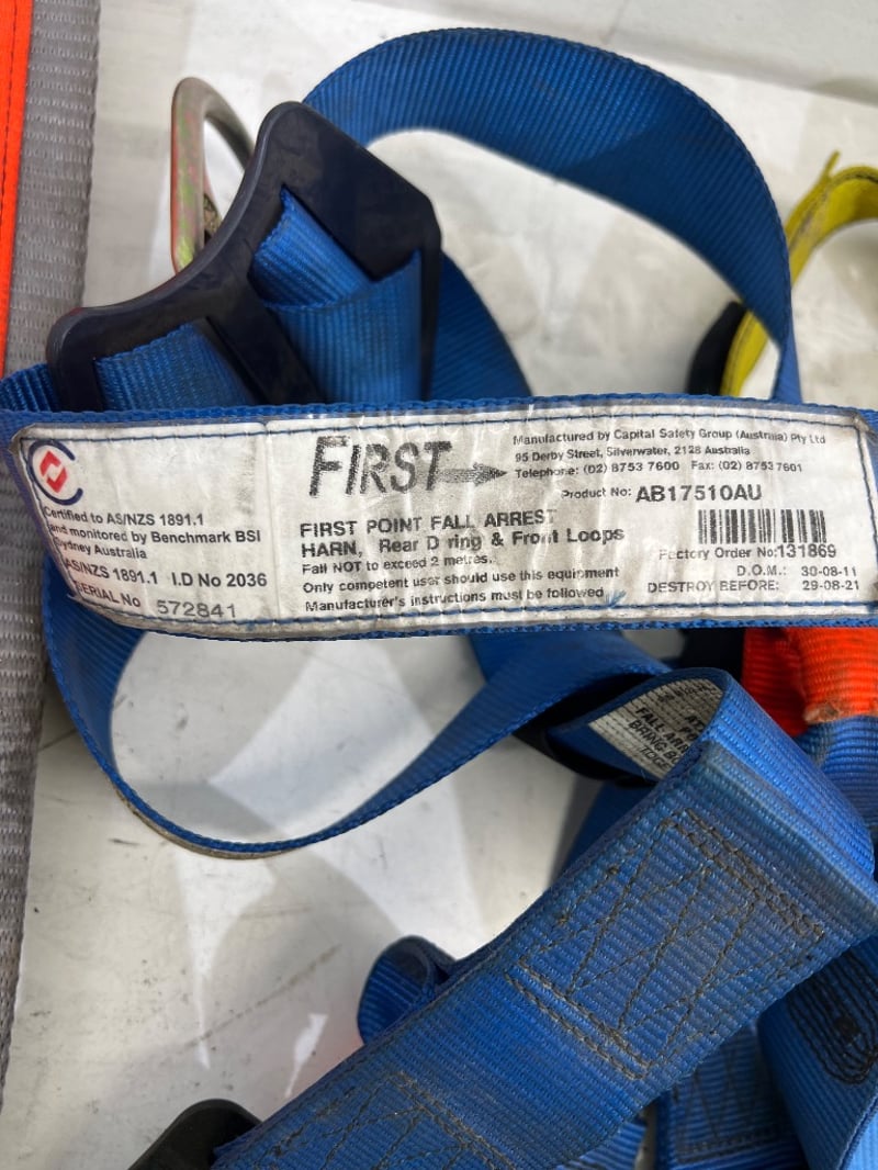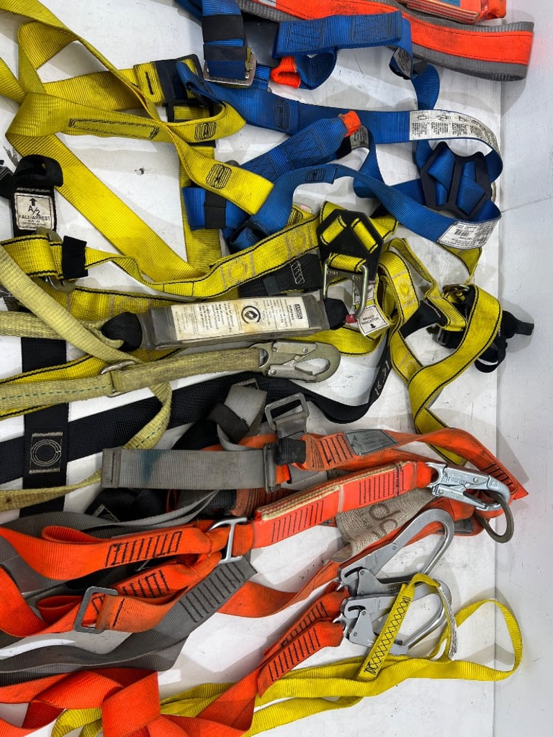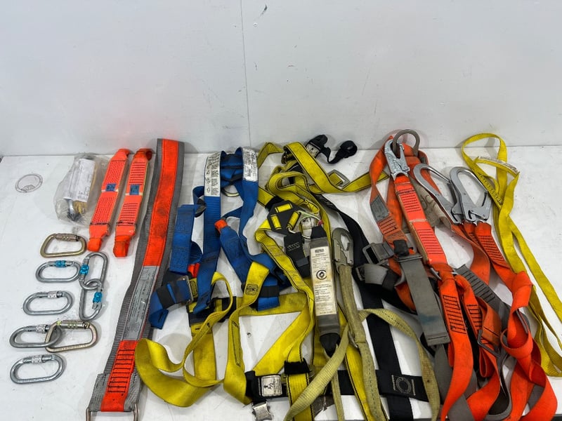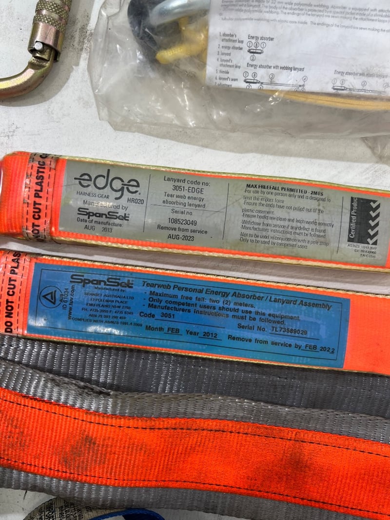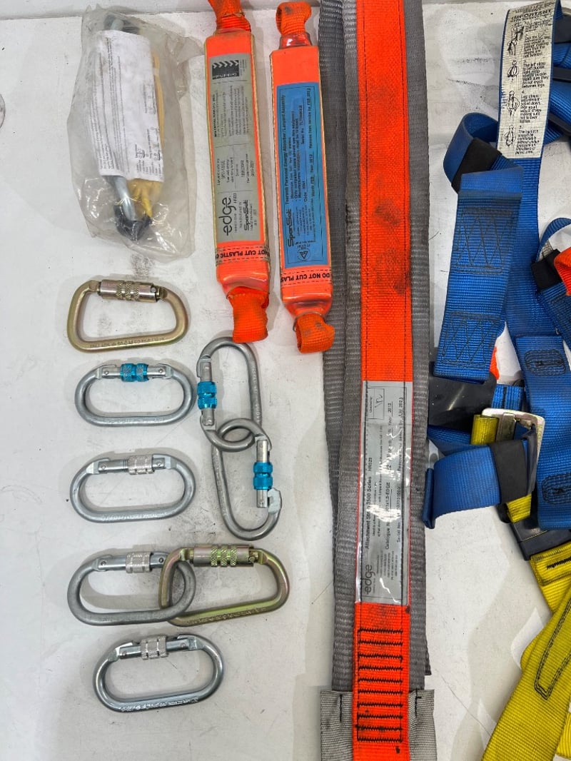 Assorted industrial height safety gear, including harnesses, shock absorbing lanyards, carabiners etc, brands include; NSA, Edge, First etc, models include; AB1751QAU, HR029, S051-EDGE etc