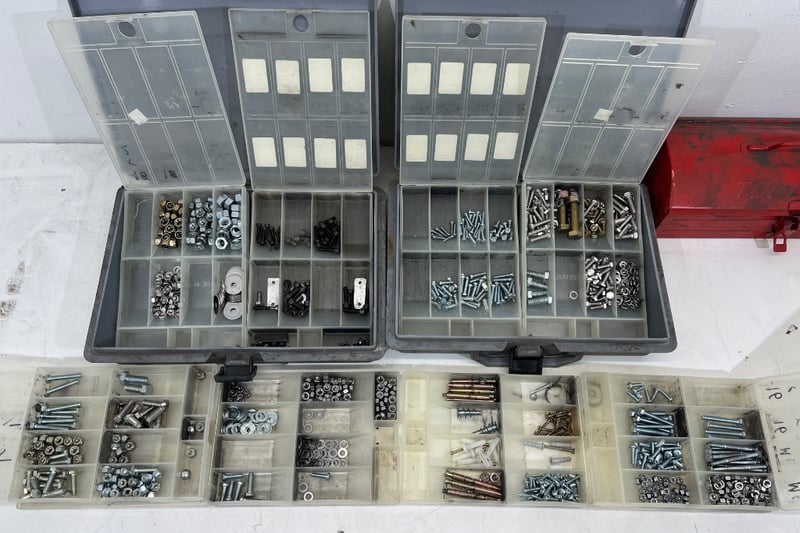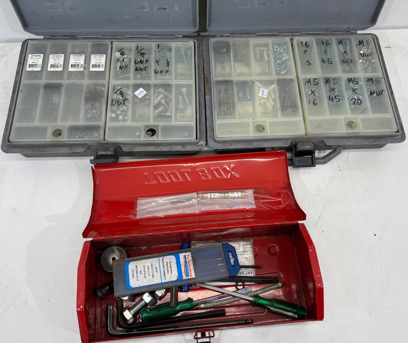 Assorted manufacturing equipment, including; nuts, bolts, screws, tool boxes etc