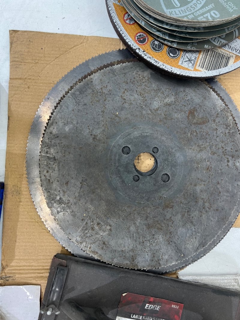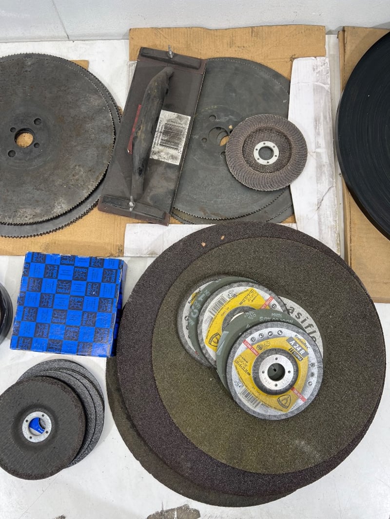Assorted Construction/ manufacturing equipment, includes; grinding discs, circular saw blades, hand sander etc, assorted sizes/ types, brands include; abrasiflex, Kronenflex, PFERD etcSold as lot