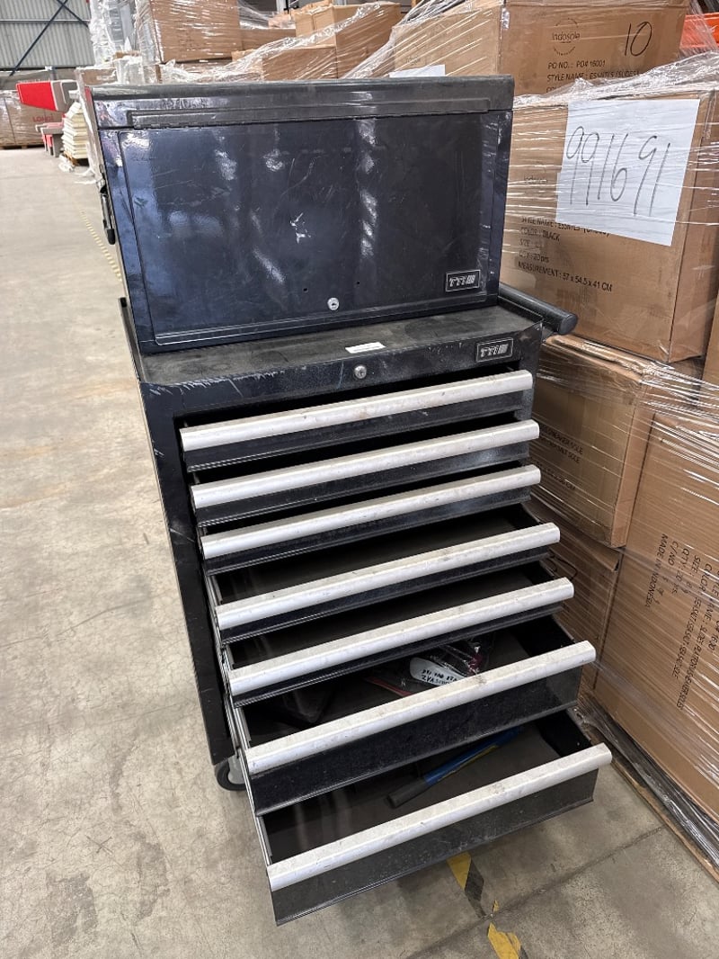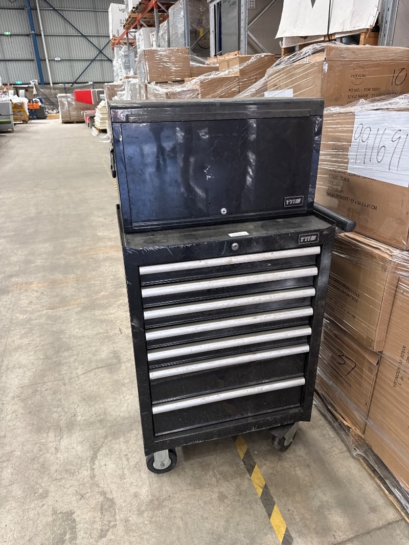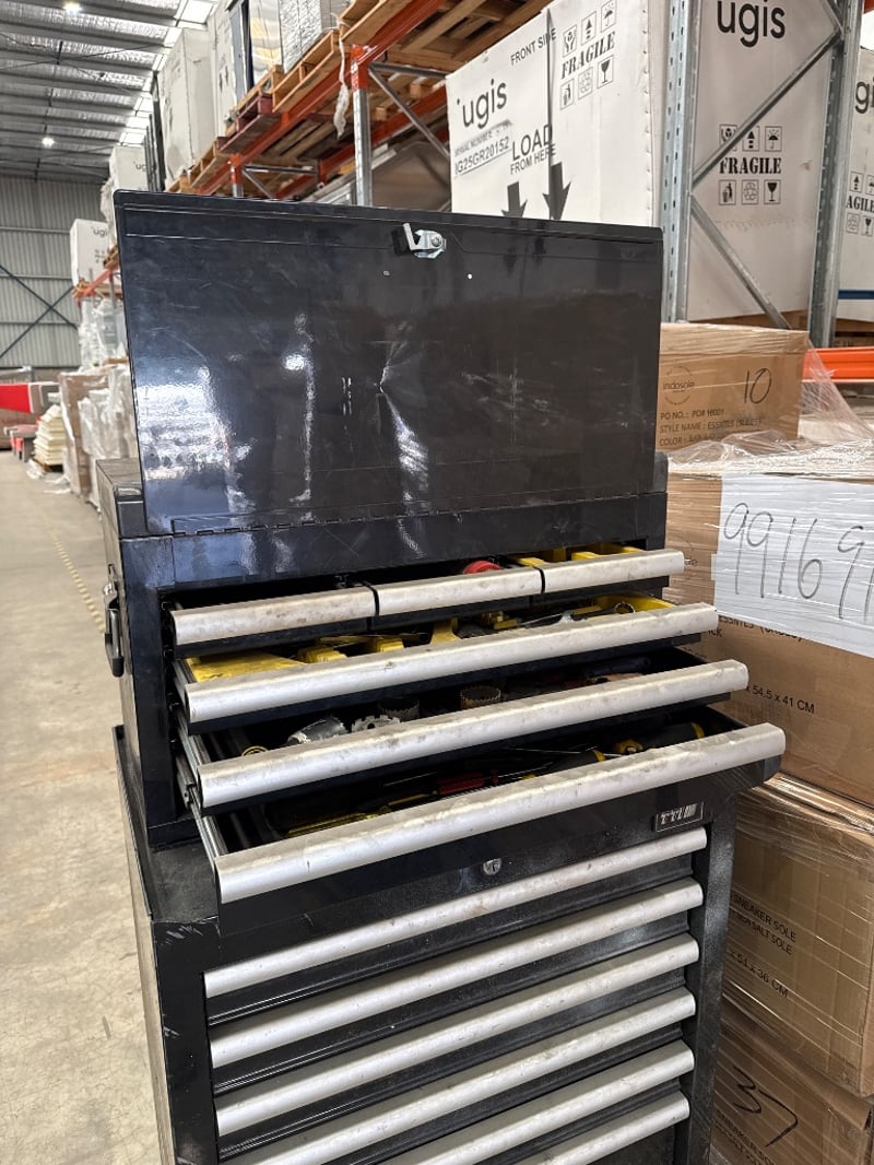 Toolbox, TTI, 7 drawers bottom,6 draws top. colour-red. Some hand tools included.