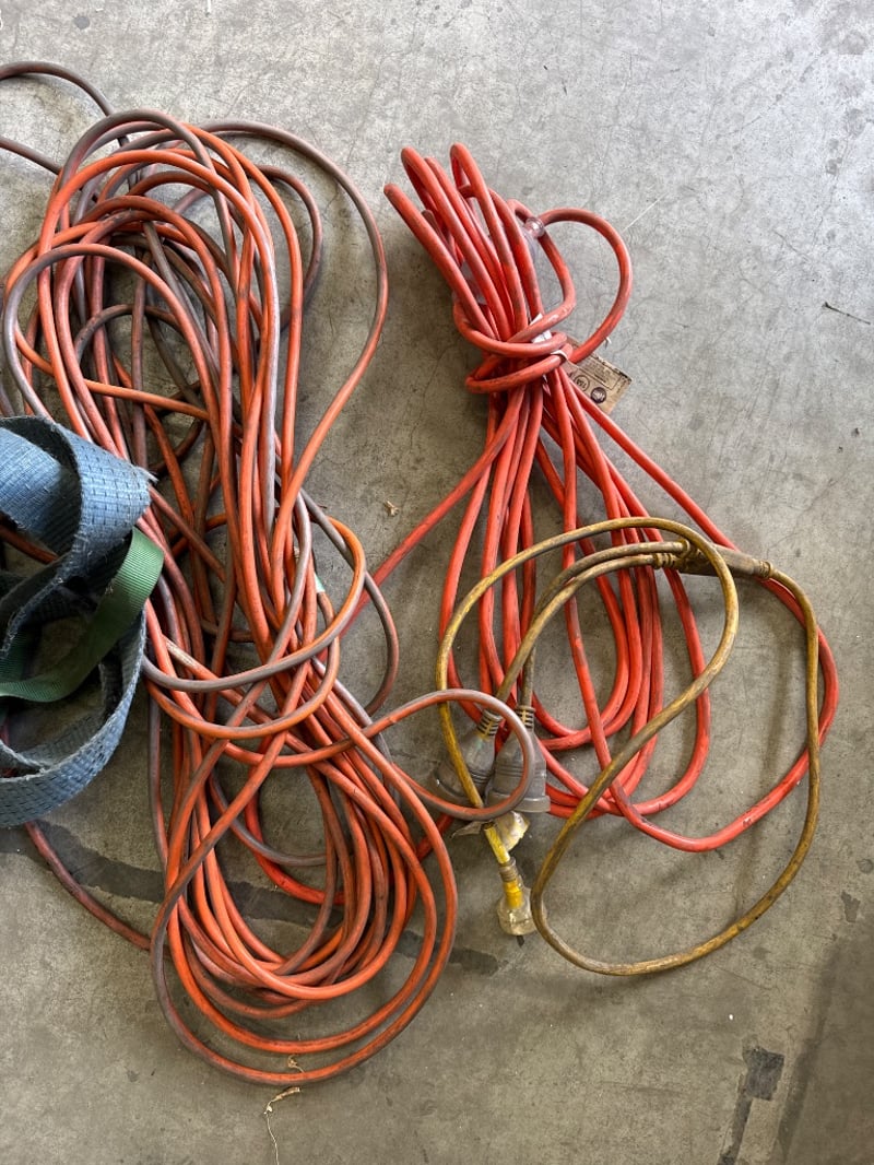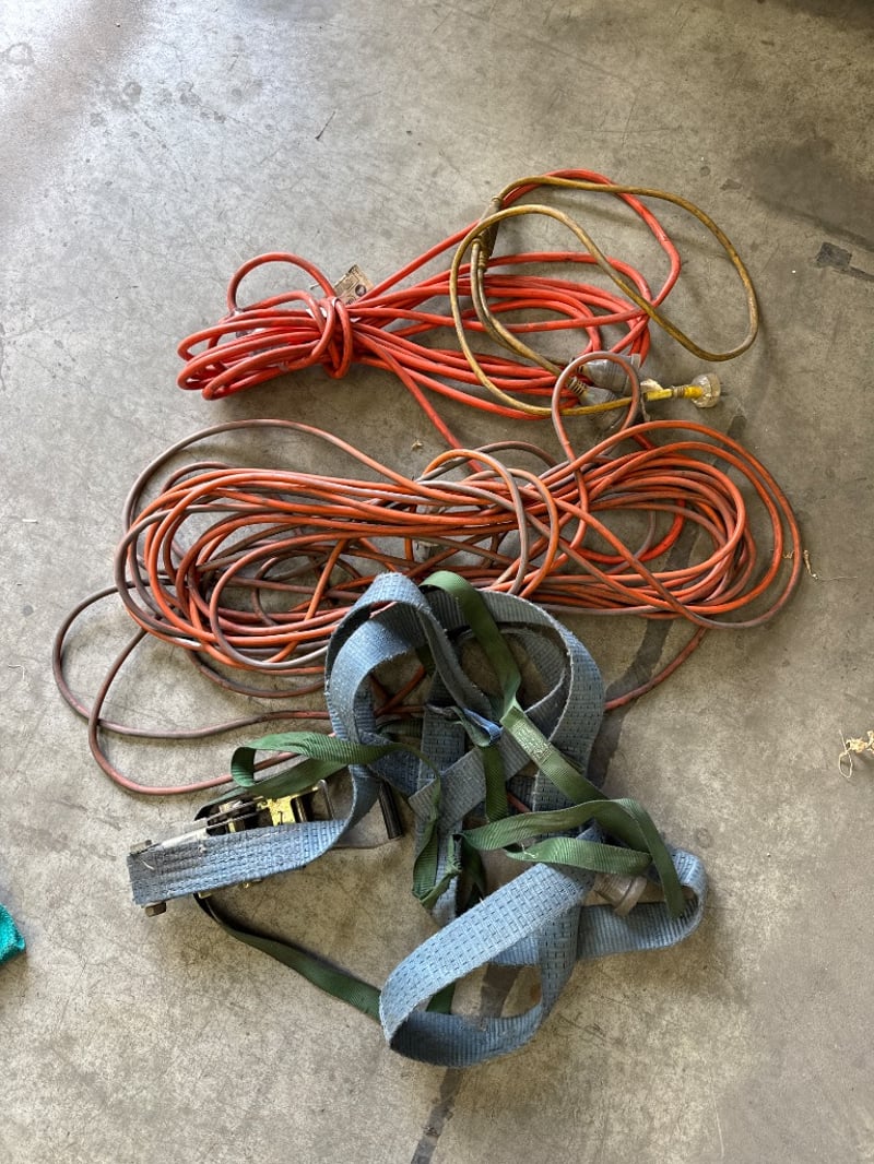 Extension Cords/ Straps, Assorted extension cord sizes and brands, Assorted Straps.