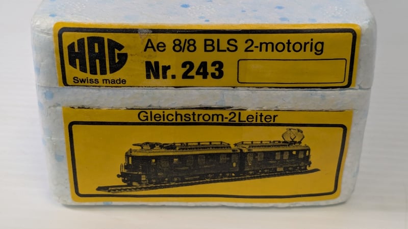 2004 HAG NR. 243 HO SCALE MODEL LOCOMOTIVE, SPECIFICALLY A BLS AE 8/8 2-MOTORIG (DUAL-MOTOR) ELECTRIC LOCOMOTIVE.