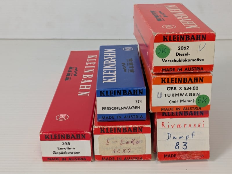 MODEL TRAINS 6 BOXED PIECES HO SCALE INCLUDING1988 KLEINBAHN 534.82 MODEL RAILWAY TOWER WAGON1988 KLEINBAHN 2062 MODEL 2062 DIESEL SHUNTING LOCOMOTIVEAND MORECondition: Good - Refer To Images232903+83