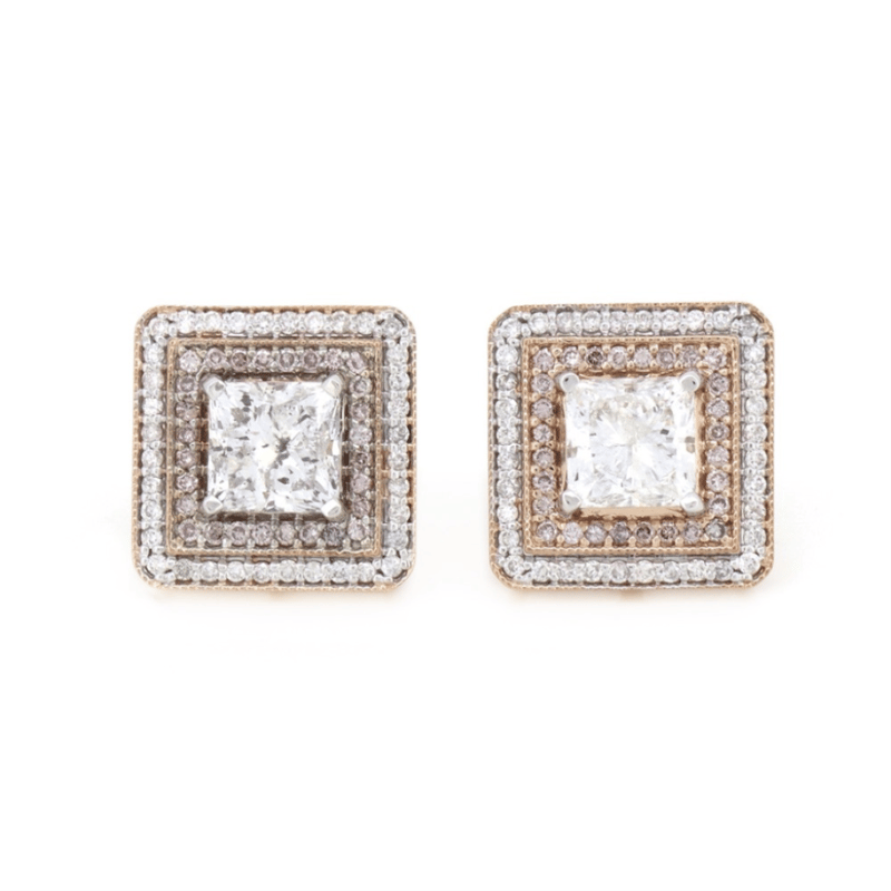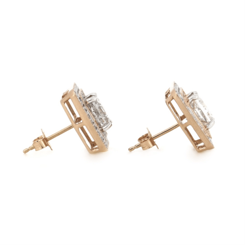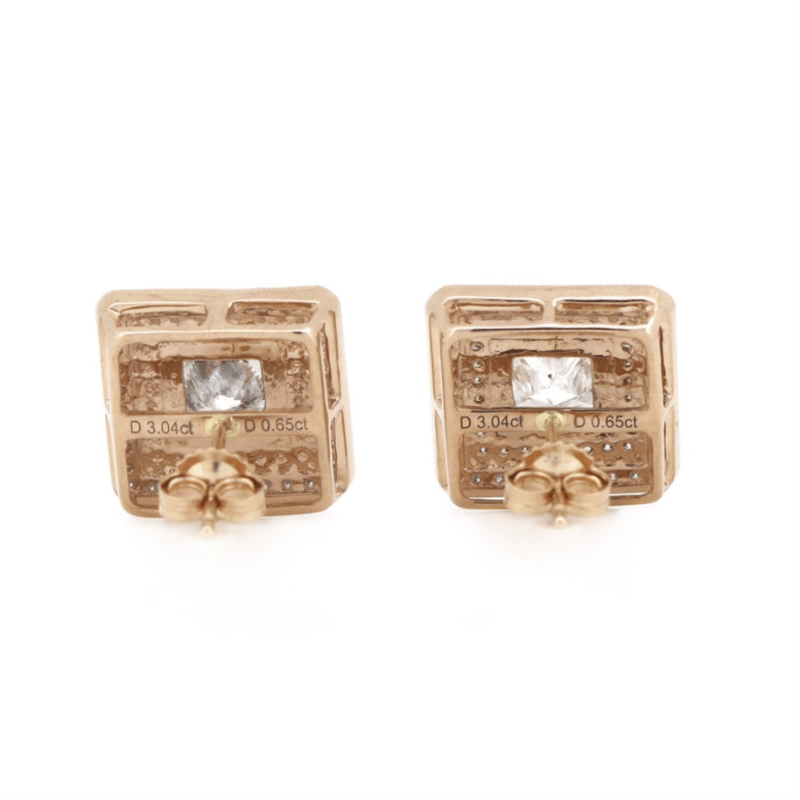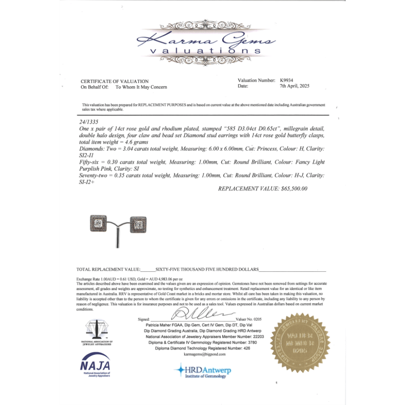 14K ROSE GOLD, PINK DIAMOND AND DIAMOND, DOUBLE HALO STUD EARRINGS. The Centres Feature, 2 Princess Cut, Diamonds (3.04Ct Tdw, H Colour, Si2-I1 Clarity), 4 Claw Set With Millegrain Detail. Surrounding The Centres In The Innermost Halo Are, 56 Round Brilliant, Fancy Light Purplish-Pink, Diamonds (0.30Ct Tdw, Si Clarity), Bead Set. Surrounding The Centre In The Outermost Halo Are, 72 Round Brilliant Cut, Diamonds (0.35Ct Tdw, H-J Colour, Si-I2 Clarity), Bead Set. The Earrings Feature 14K Rose Gold Butterfly Clasps. Valuations Provided by an Independent Third-Party Professional Not Directly Associated With Lloyds Auctions at AUD $$65,500.00This valuation has been conducted by an independent third-party professional. The valuation amount is an assessment by the issuing valuer and does not reflect the auction value of the item. Any inquiries regarding the valuation should be directed to the issuing valuer (refer to contact details on the certificate), as Lloyds Auctions has no affiliation or influence over the valuation, the valuer, or the stated amount. Condition: Good - Refer Images 0645978+9105