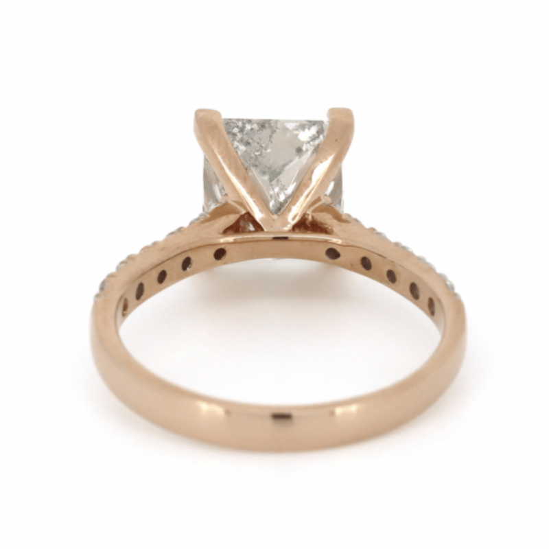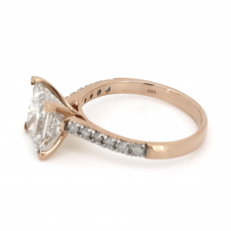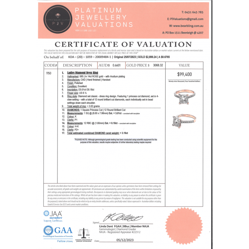 14K ROSE GOLD AND DIAMOND, CLASSIC RING. The Centre Features, One Square Princess Brilliant Cut, Diamond (3.01Ct, K Colour, P1 Clarity), Claw Set. Decorating The Band Are, 12 Round Brilliant Cut, Diamonds (0.18Ct Tdw, H-J Colour, P1+ Clarity), Bead Set. Ring Size M 1/2. Valuations Provided by an Independent Third-Party Professional Not Directly Associated With Lloyds Auctions at AUD $$99,400.00This valuation has been conducted by an independent third-party professional. The valuation amount is an assessment by the issuing valuer and does not reflect the auction value of the item. Any inquiries regarding the valuation should be directed to the issuing valuer (refer to contact details on the certificate), as Lloyds Auctions has no affiliation or influence over the valuation, the valuer, or the stated amount. Condition: Good - Refer Images 0645978+9110