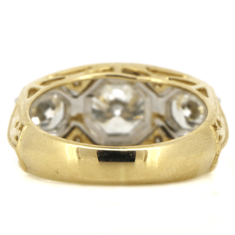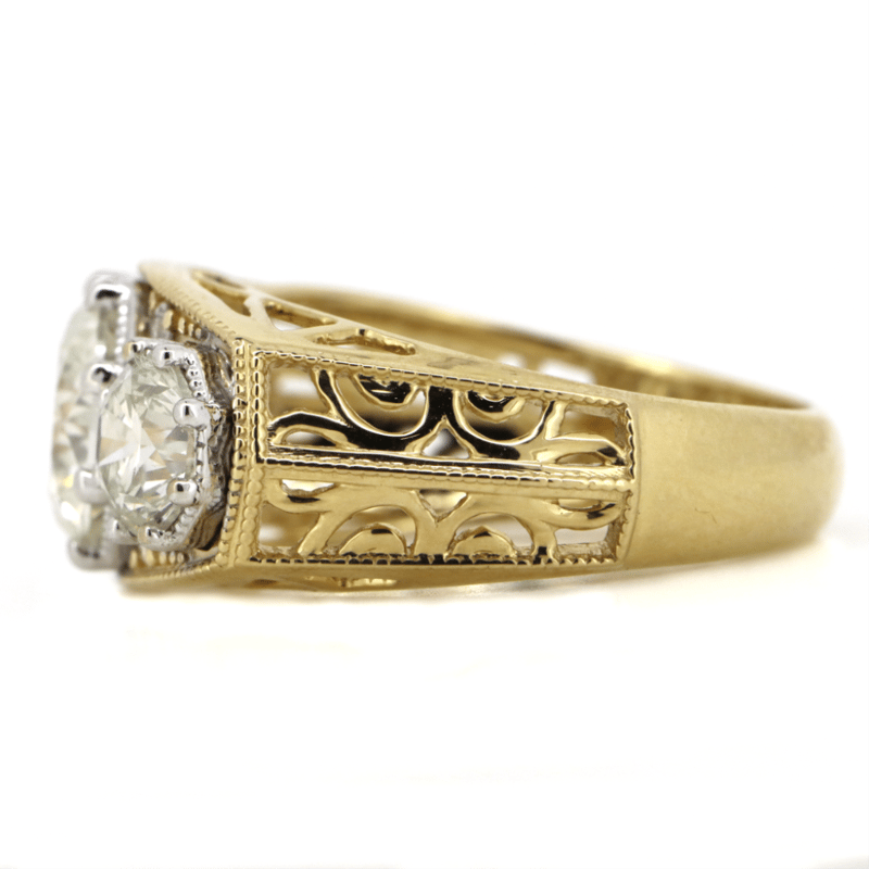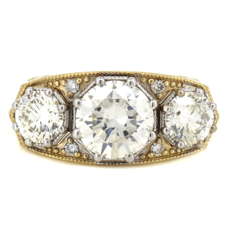 14K YELLOW/WHITE GOLD AND DIAMOND, TRILOGY RING. The Centre Features, One Round Brilliant Cut, Diamond (2.04Ct, H-I Colour, Si1-Si2 Clarity), 8 Claw Set. Flanking Either Side Of The Centre Are, 2 Round Brilliant Cut, Diamonds (1.36Ct Tdw, H-I Colour, Si1-Si2 Clarity), 8 Claw Set, Accompanied By, 4 Round Brilliant Cut, Diamonds (0.06Ct Tdw, G-H Colour, Si1-Si2 Clarity), Micro-Claw Set. Ring Size N. Valuations Provided by an Independent Third-Party Professional Not Directly Associated With Lloyds Auctions at AUD $$80,000.00This valuation has been conducted by an independent third-party professional. The valuation amount is an assessment by the issuing valuer and does not reflect the auction value of the item. Any inquiries regarding the valuation should be directed to the issuing valuer (refer to contact details on the certificate), as Lloyds Auctions has no affiliation or influence over the valuation, the valuer, or the stated amount. Condition: Good - Refer Images 0645978+9112