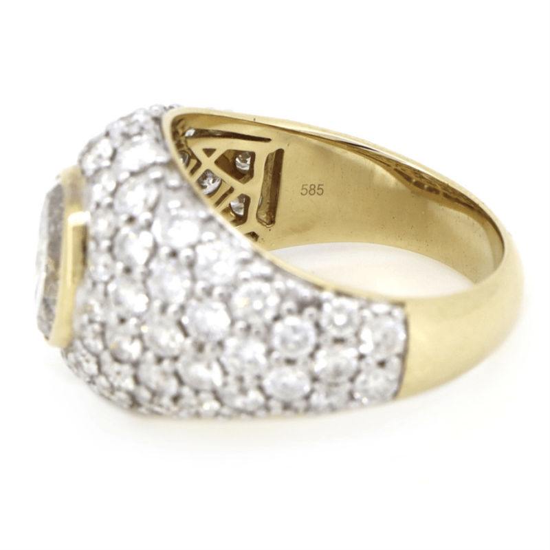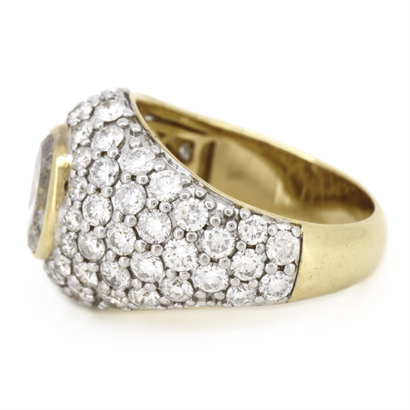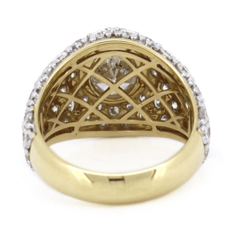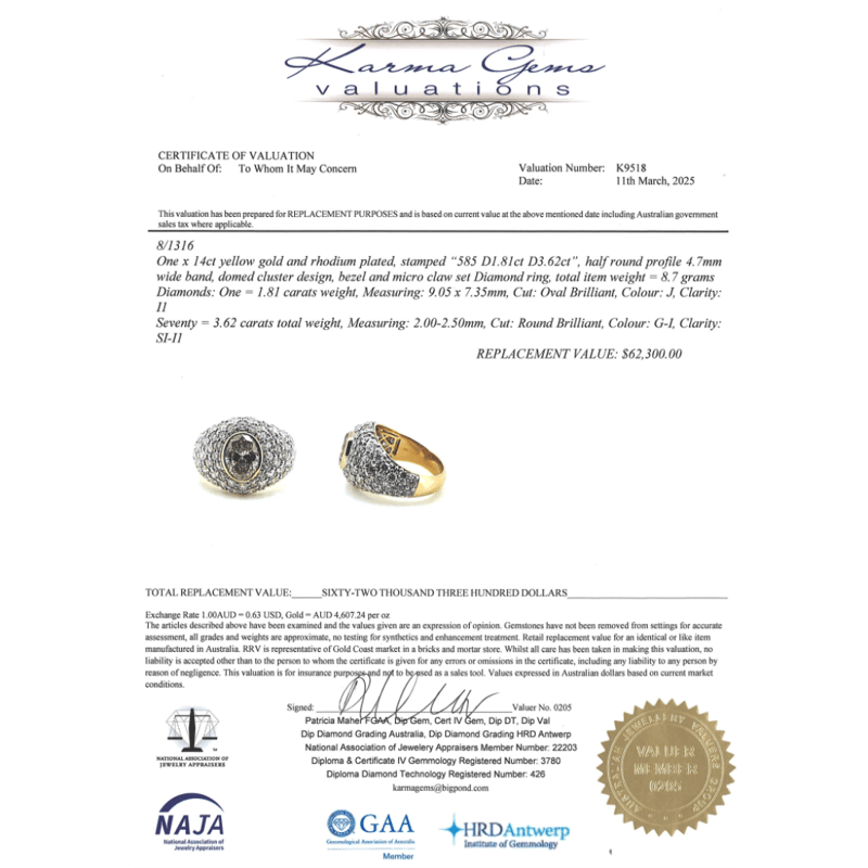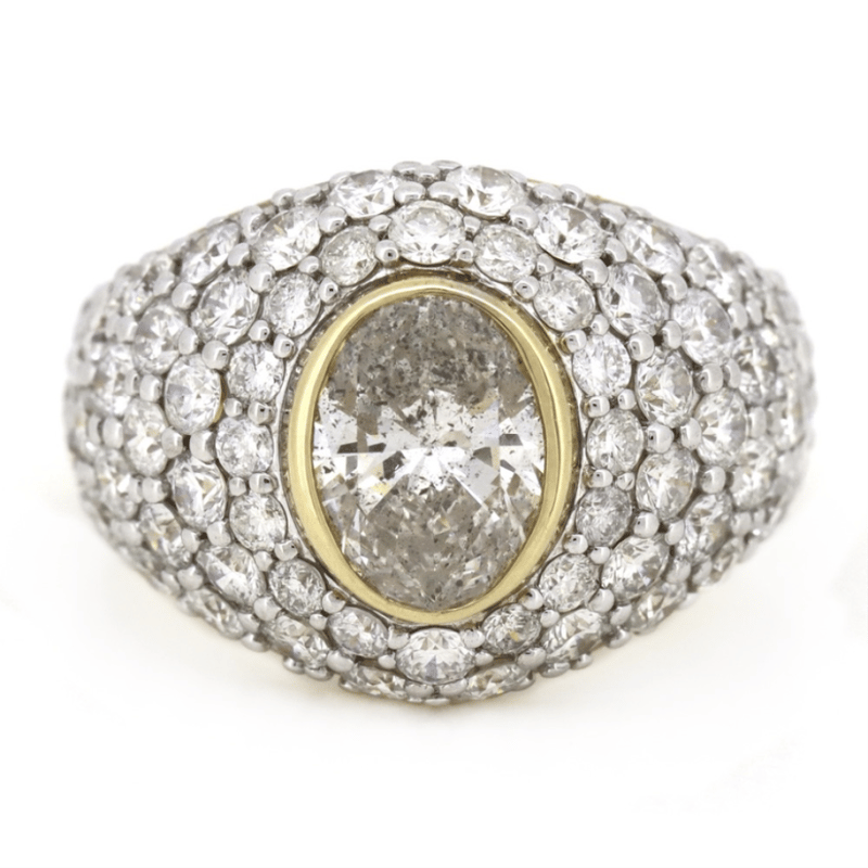 14K YELLOW/WHITE GOLD AND DIAMOND, STATEMENT CLUSTER RING. The Centre Features, One Oval Brilliant Cut, Diamond (1.81Ct, J Colour, I1 Clarity), Bezel Set. Embellishing The Design Are, 70 Round Brilliant Cut, Diamonds (3.62Ct Tdw, G-I Colour, Si-I1 Clarity), Bead/Pave Set. Ring Size R. Valuations Provided by an Independent Third-Party Professional Not Directly Associated With Lloyds Auctions at AUD $$62,300.00This valuation has been conducted by an independent third-party professional. The valuation amount is an assessment by the issuing valuer and does not reflect the auction value of the item. Any inquiries regarding the valuation should be directed to the issuing valuer (refer to contact details on the certificate), as Lloyds Auctions has no affiliation or influence over the valuation, the valuer, or the stated amount. Condition: Good - Refer Images 0645978+9113