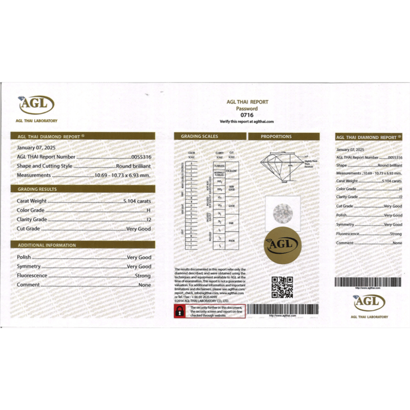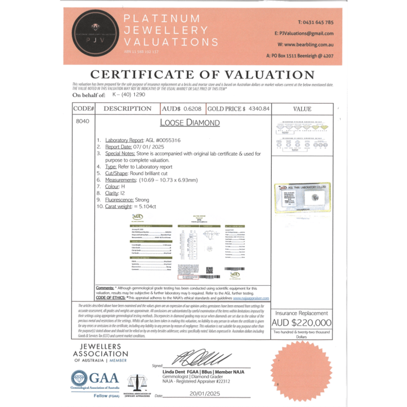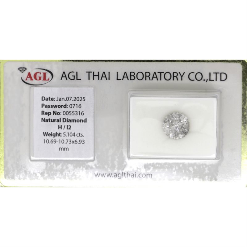 5.104CT CERTIFIED, NATURAL DIAMOND Round Brilliant Cut, H Colour, I2 Clarity, Loose, Unset. Stone Comes Sealed With Agl Report: #0055316. Valuations Provided by an Independent Third-Party Professional Not Directly Associated With Lloyds Auctions at AUD $$220,000.00This valuation has been conducted by an independent third-party professional. The valuation amount is an assessment by the issuing valuer and does not reflect the auction value of the item. Any inquiries regarding the valuation should be directed to the issuing valuer (refer to contact details on the certificate), as Lloyds Auctions has no affiliation or influence over the valuation, the valuer, or the stated amount. Condition: Good - Refer Images 0645978+9114