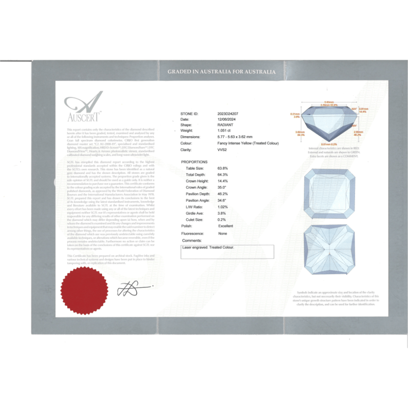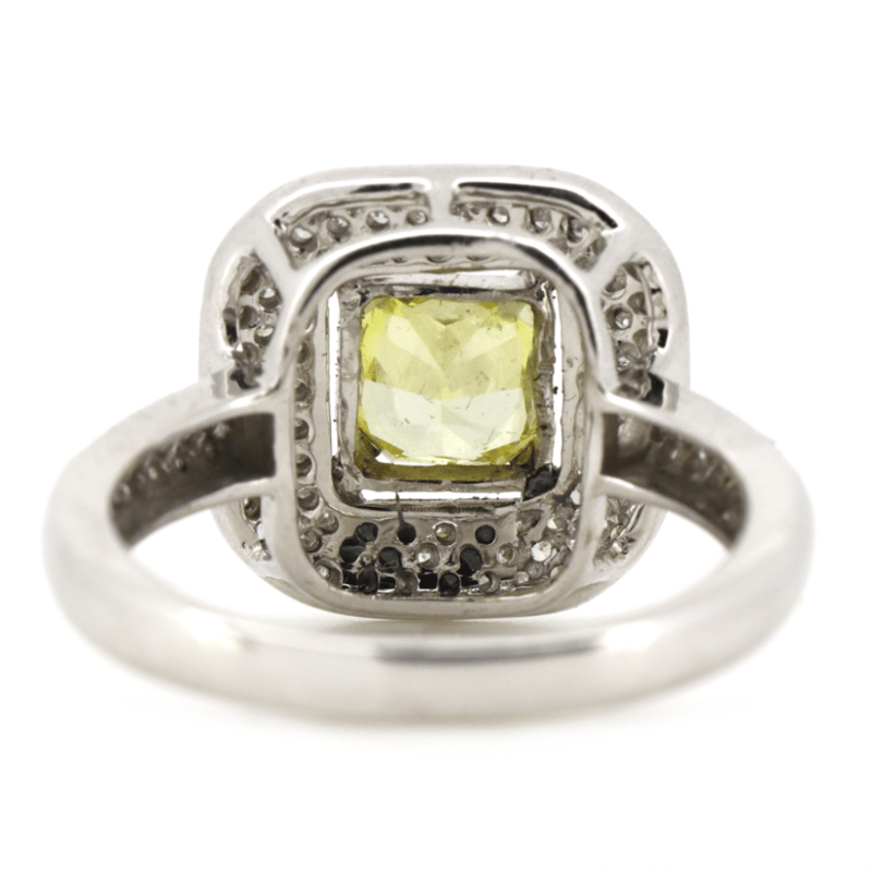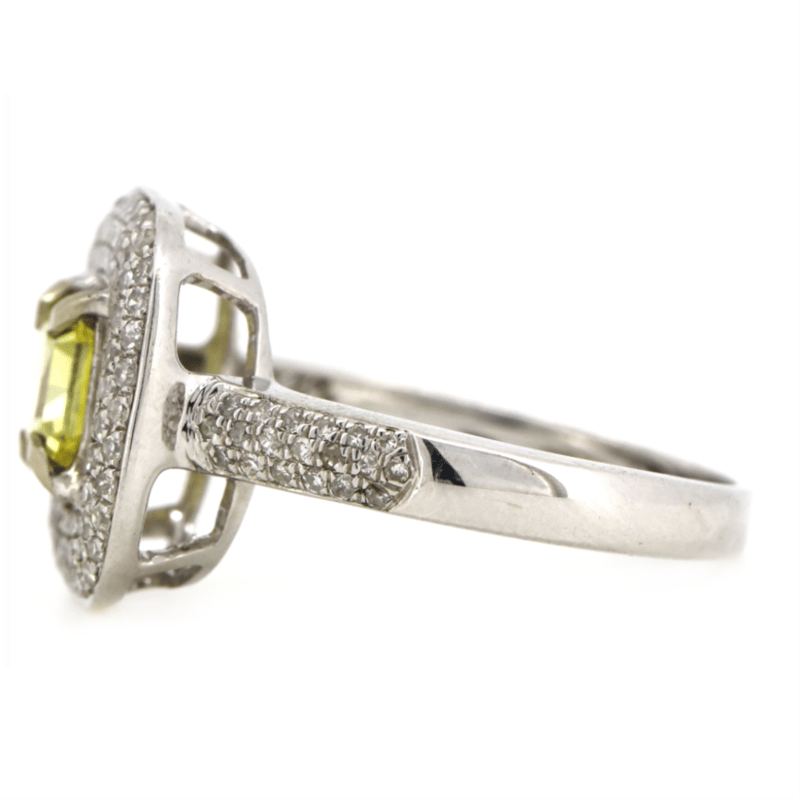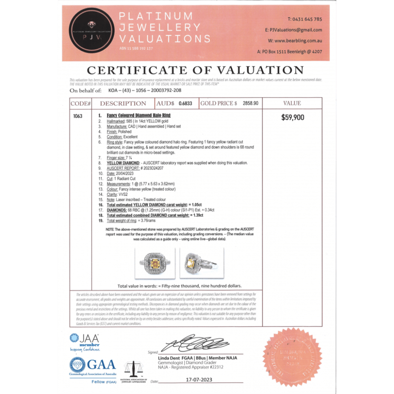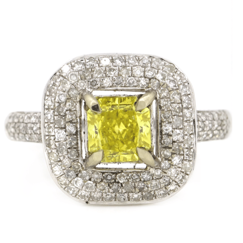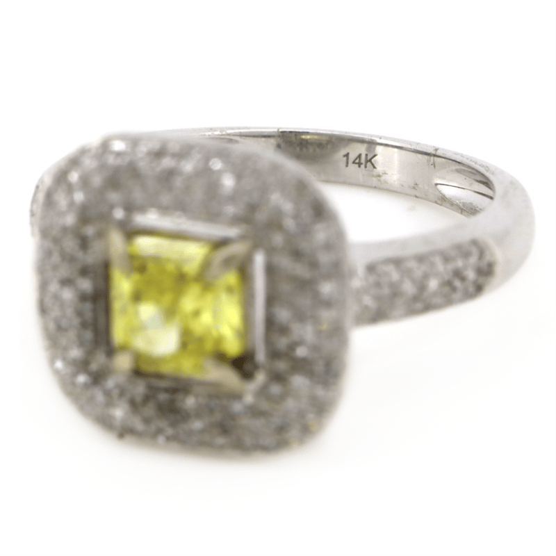 14K WHITE GOLD, FANCY YELLOW DIAMOND AND DIAMOND, HALO RING. The Centre Features, One Princess Cut, Fancy Vivid Yellow, Diamond (1.05Ct, Colour Treated, Vvs2 Clarity), 4 Claw Set. Surrounding The Centre In A Cluster Halo Design And Decorating The Band Are, 68 Round Brilliant Cut, Diamonds (0.34Ct Tdw, G-H Colour, Si1-P1 Clarity), Pave Set. Auscert Diamond Report: 2023D24207. Ring Size O. Valuations Provided by an Independent Third-Party Professional Not Directly Associated With Lloyds Auctions at AUD $$59,900.00This valuation has been conducted by an independent third-party professional. The valuation amount is an assessment by the issuing valuer and does not reflect the auction value of the item. Any inquiries regarding the valuation should be directed to the issuing valuer (refer to contact details on the certificate), as Lloyds Auctions has no affiliation or influence over the valuation, the valuer, or the stated amount. Condition: Good - Refer Images 0645978+9118