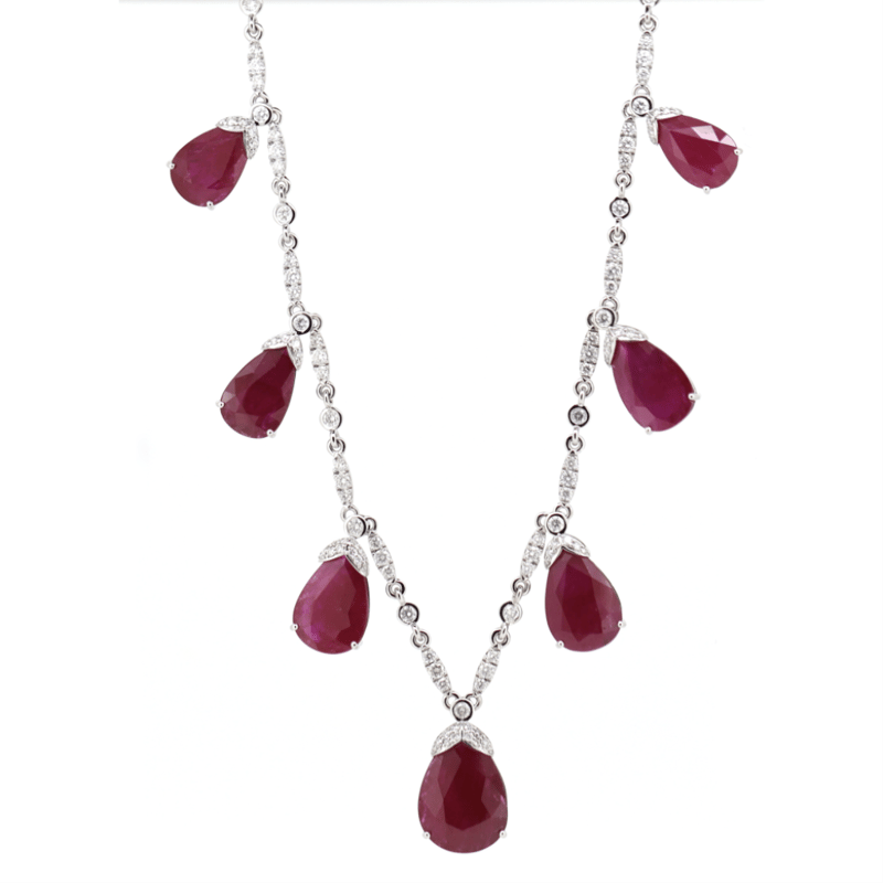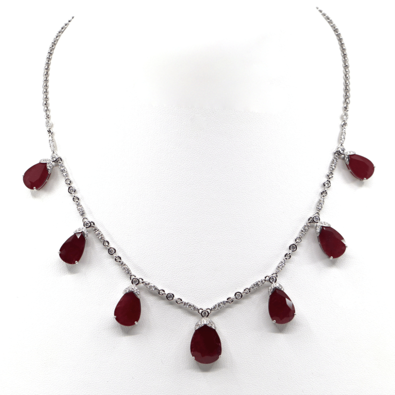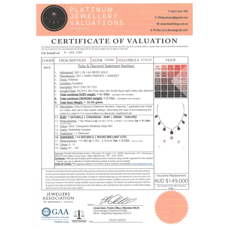 14K WHITE GOLD, RUBY AND DIAMOND, STATEMENT NECKLACE. The Necklace Features, 7 Pear Cut, Moderate Deep Red, Rubies (51.59Ct Tsw, Moderately Included, Enhanced), Claw Set. Decorating The Chain And Encompassing The Rubies Are, 114 Round Brilliant Cut, Diamonds (2.72Ct Tdw, G-H Colour, Si1-Si2 Clarity), Bead/Bezel Set. The Necklace Features A Box Snap/Double Figure Clasp. Total Length Of Necklace Is 46.5Cm. Valuations Provided by an Independent Third-Party Professional Not Directly Associated With Lloyds Auctions at AUD $$149,000.00This valuation has been conducted by an independent third-party professional. The valuation amount is an assessment by the issuing valuer and does not reflect the auction value of the item. Any inquiries regarding the valuation should be directed to the issuing valuer (refer to contact details on the certificate), as Lloyds Auctions has no affiliation or influence over the valuation, the valuer, or the stated amount. Condition: Good - Refer Images 0645978+9131