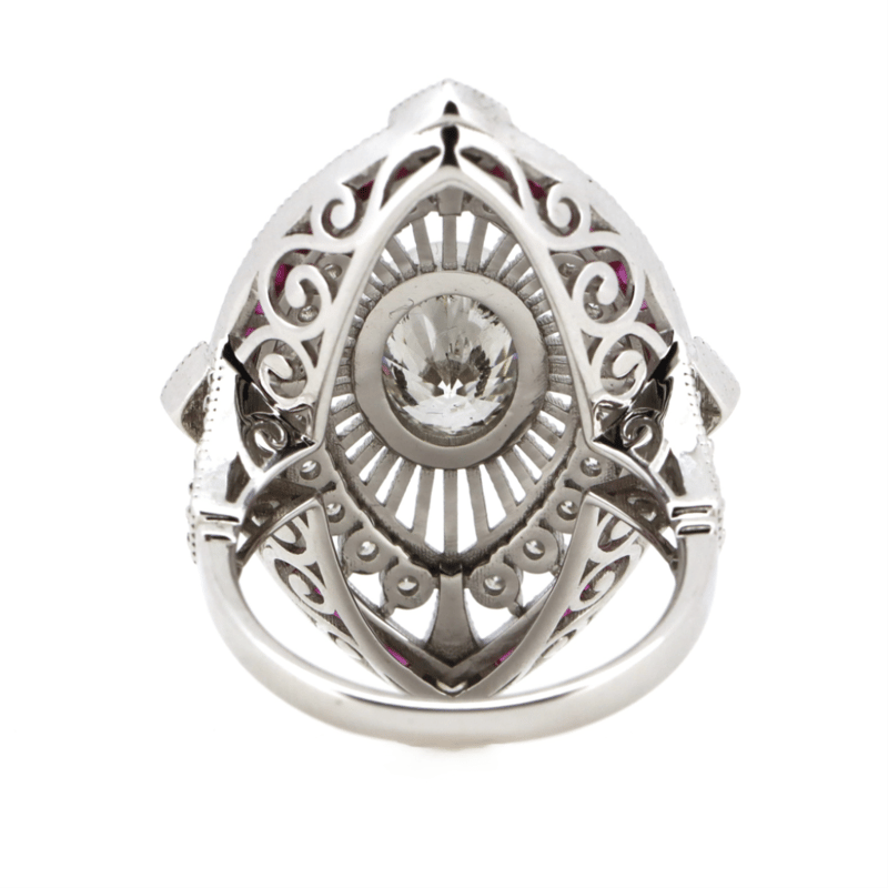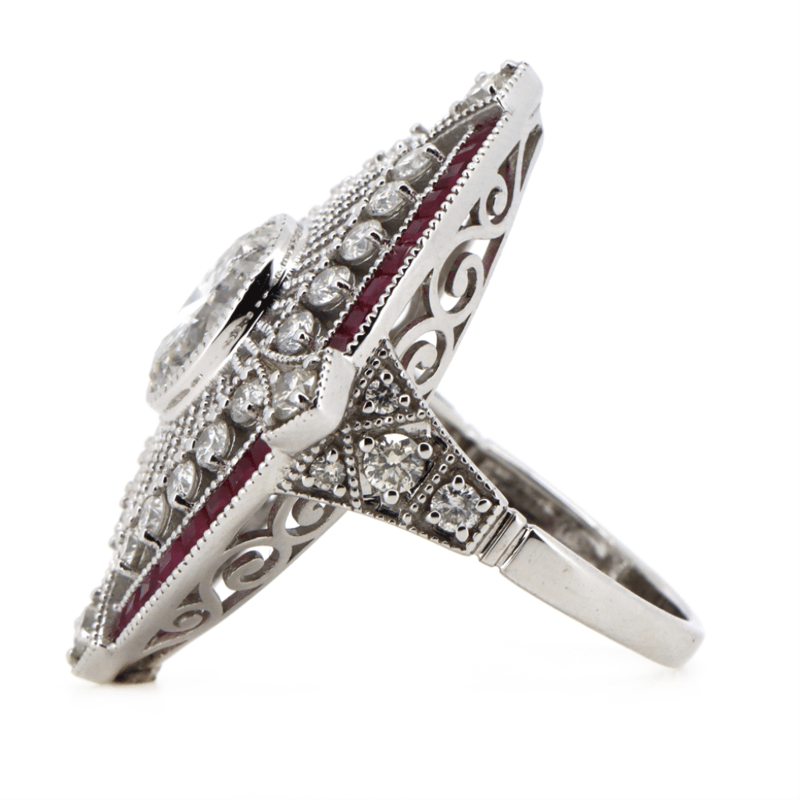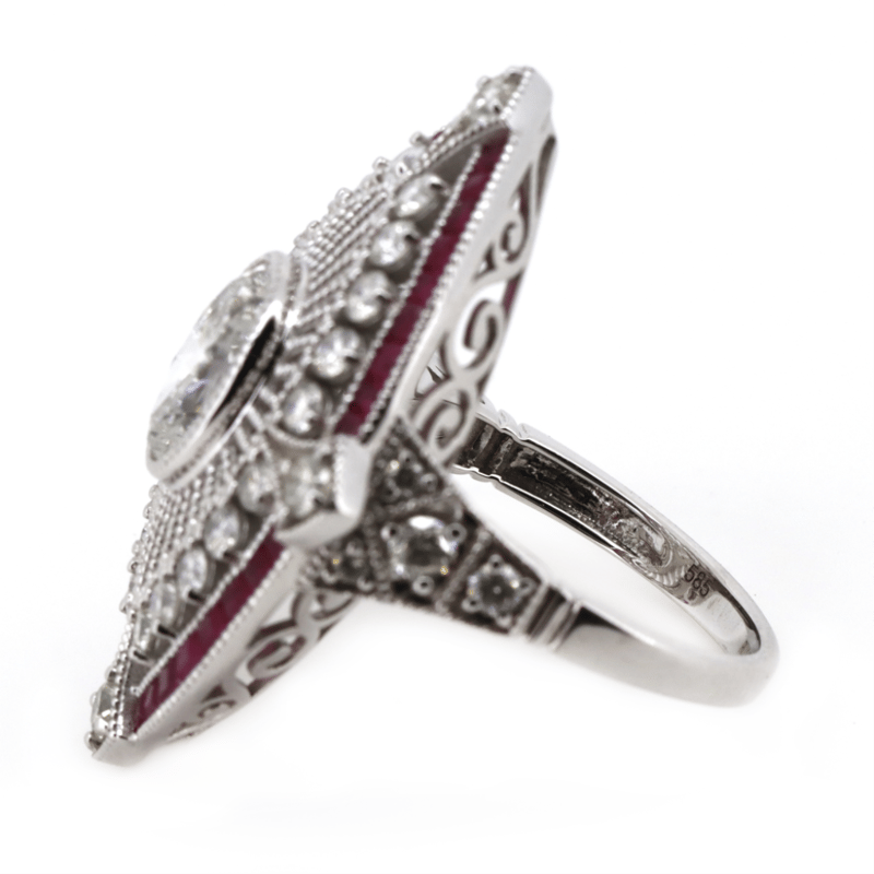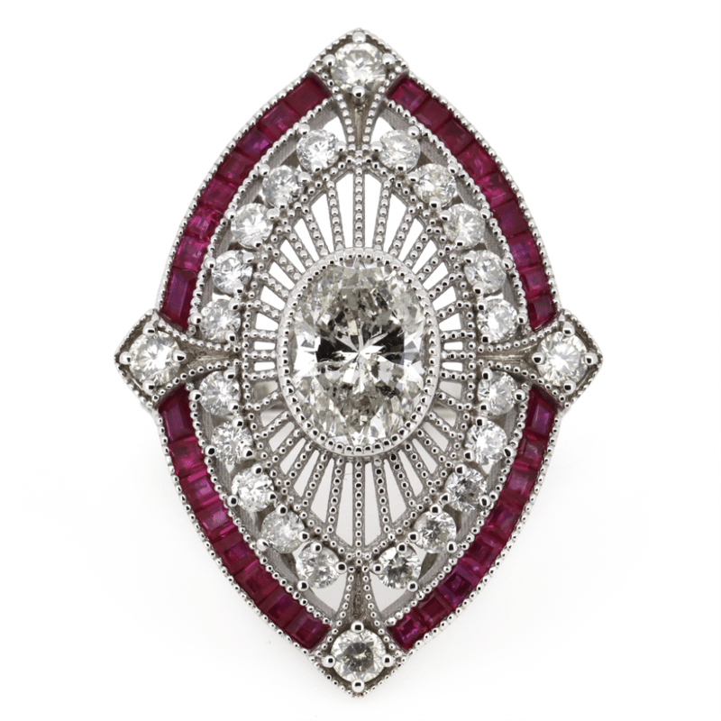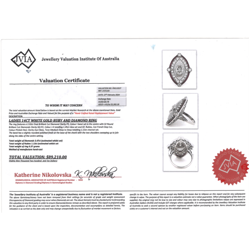 14K WHITE GOLD, RUBY AND DIAMOND, ART DECO INSPIRED RING. The Centre Features, One Oval Brilliant Cut, Diamond (2.02Ct, I Colour, P2 Clarity), Bezel Set. Surrounding The Centre Are, 32 Round Brilliant Cut, Diamonds (1.45Ct Tdw, J-K Colour, Si2-P2 Clarity), Claw Set. Bordering The Design Are, 33 French Step Cut, Deep Pinkish-Red, Rubies (1.13Ct Tsw, Eye Clean Clarity), Channel Set. Ring Size O 1/2. Valuations Provided by an Independent Third-Party Professional Not Directly Associated With Lloyds Auctions at AUD $$89,210.00This valuation has been conducted by an independent third-party professional. The valuation amount is an assessment by the issuing valuer and does not reflect the auction value of the item. Any inquiries regarding the valuation should be directed to the issuing valuer (refer to contact details on the certificate), as Lloyds Auctions has no affiliation or influence over the valuation, the valuer, or the stated amount. Condition: Good - Refer Images 0645978+9132