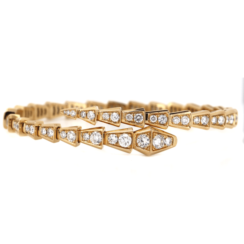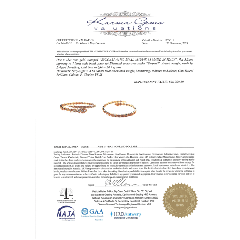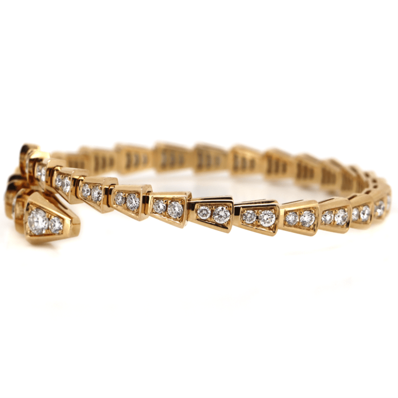 18K ROSE GOLD AND 4.50CT TDW DIAMOND, BVLGARI 'SERPENTI VIPER' STRETCH BANGLE. The Design Features A Flexible/Stretch Serpent Scale Design Embellishing With, 68 Round Brilliant Cut, Diamonds (4.50Ct Tdw, F Colour, Vs-Si Clarity), Bead Set. The Bracelets Inner Resting Dimensions Are 58Mm X 47Mm. Valuations Provided by an Independent Third-Party Professional Not Directly Associated With Lloyds Auctions at AUD $$96,000.00This valuation has been conducted by an independent third-party professional. The valuation amount is an assessment by the issuing valuer and does not reflect the auction value of the item. Any inquiries regarding the valuation should be directed to the issuing valuer (refer to contact details on the certificate), as Lloyds Auctions has no affiliation or influence over the valuation, the valuer, or the stated amount. Condition: Good - Refer Images 0645978+9138