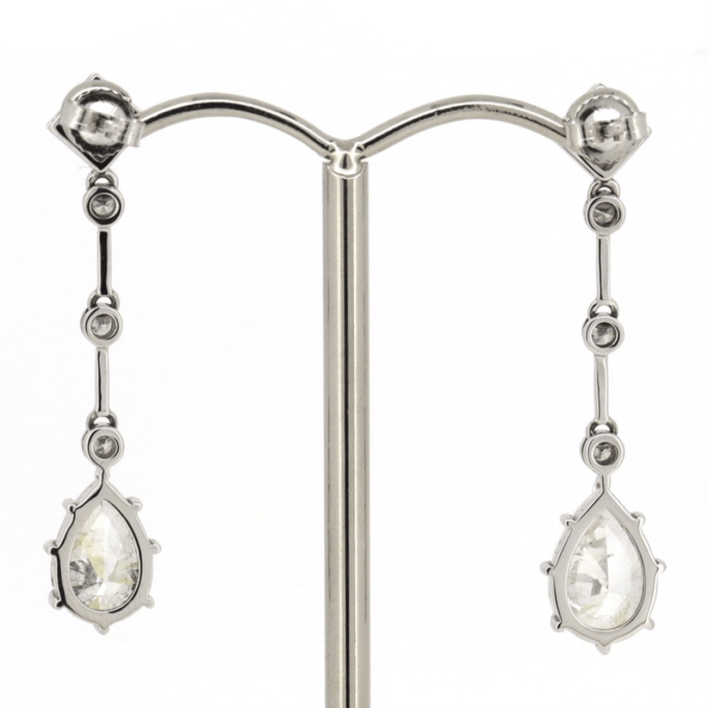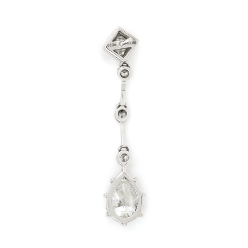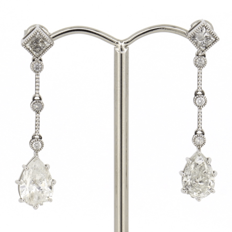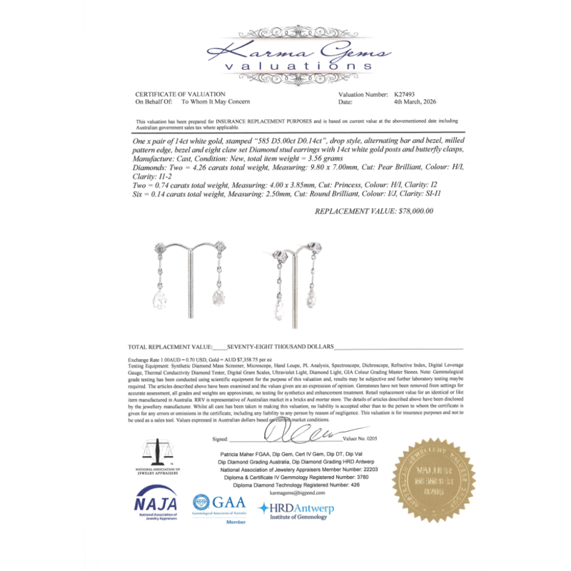14K WHITE GOLD AND DIAMOND, DROP EARRINGS. The Design Features, 2 Modified Brilliant Pear Cut, Diamonds (4.26Ct Tdw, G-H Colour, P1-P2 Clarity), 7 Claw Basket Set. Accompanied By, 2 Square Princess Cut, Diamonds (0.74Ct Tdw, G-H Colour, P1-P2 Clarity), With 6 Round Brilliant Cut, Diamonds (0.14Ct Tdw, I-J Colour, Si2-P1 Clarity), Bezel Set With A Millegrain Finish Each Linked By Tension Bar. The Earrings Have Post Backs With 14K White Gold Butterfly Clasps. Valuations Provided by an Independent Third-Party Professional Not Directly Associated With Lloyds Auctions at AUD $$78,000.00This valuation has been conducted by an independent third-party professional. The valuation amount is an assessment by the issuing valuer and does not reflect the auction value of the item. Any inquiries regarding the valuation should be directed to the issuing valuer (refer to contact details on the certificate), as Lloyds Auctions has no affiliation or influence over the valuation, the valuer, or the stated amount. Condition: Good - Refer Images 0645978+9146