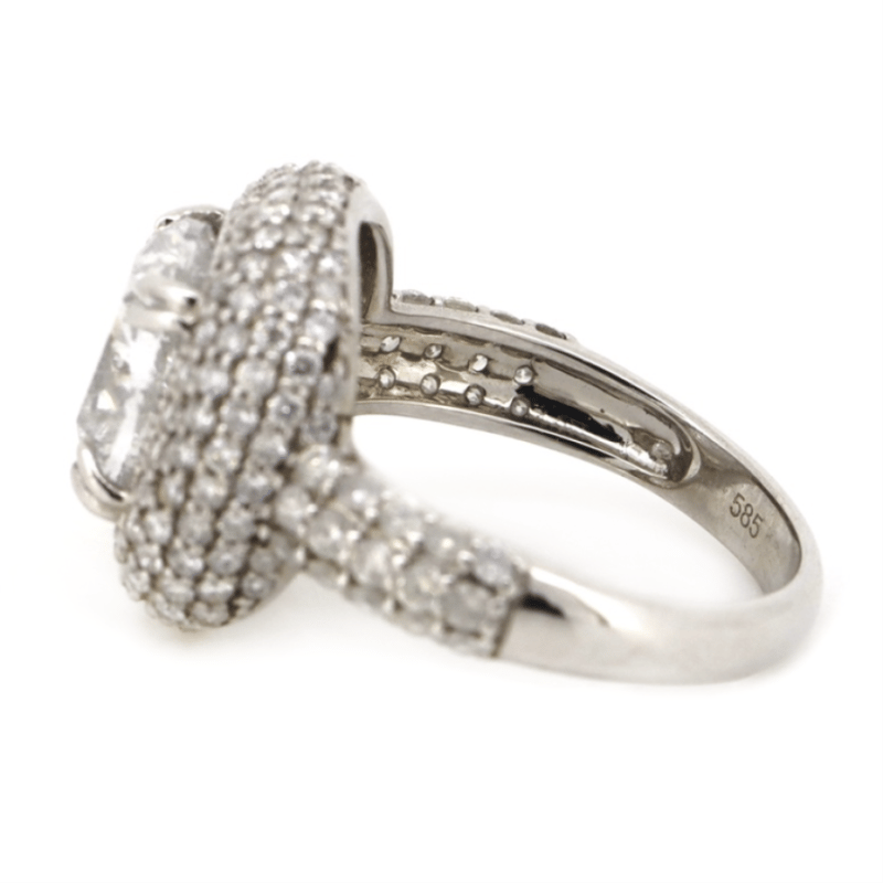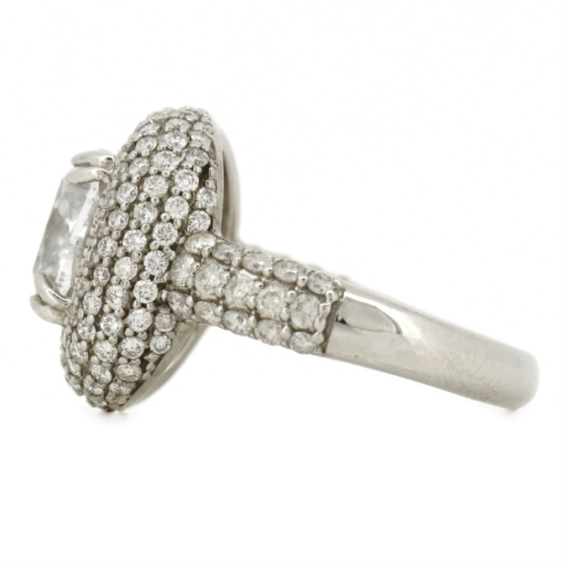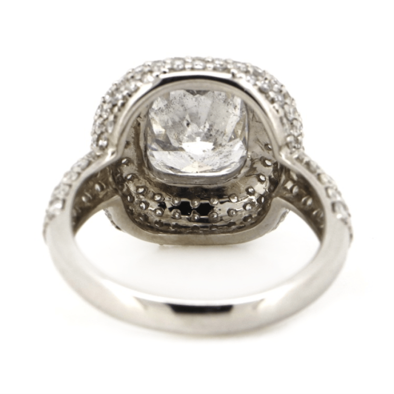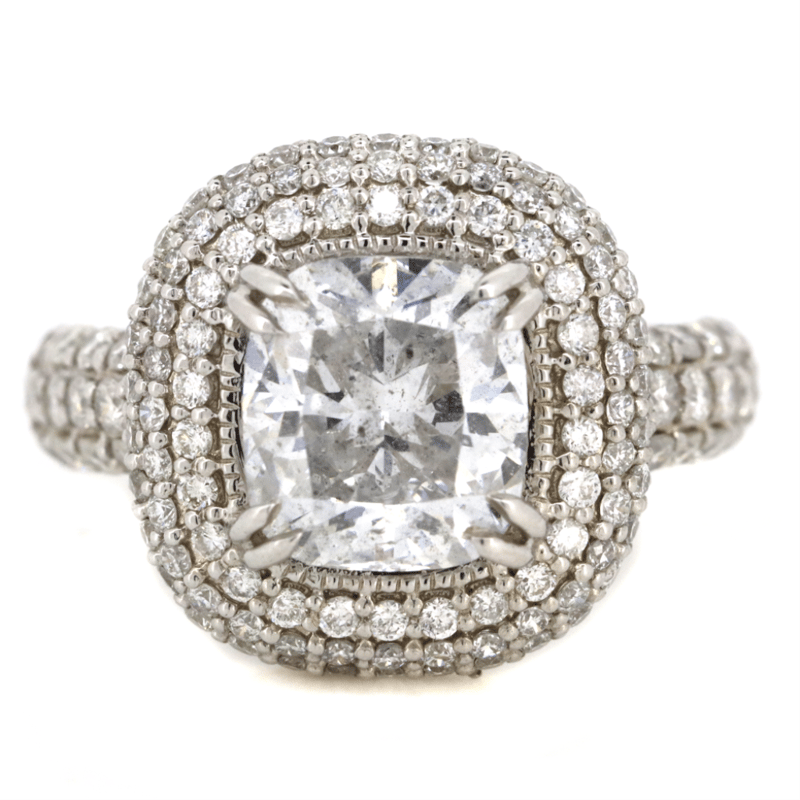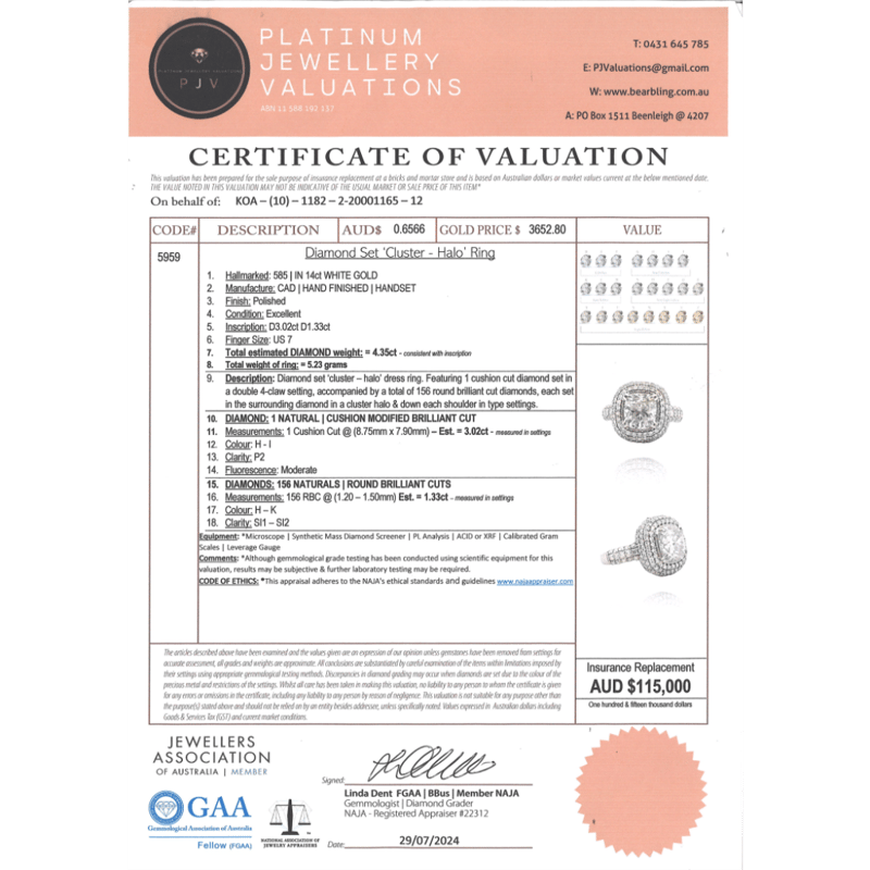 WHITE GOLD AND DIAMOND, CLUSTER RING. The Centre Features, One Cushion Cut, Diamond (3.02Ct, H-I Colour, P2 Clarity), Double 4 Claw Set. Surrounding The Centre In A Cluster Are, 156 Round Brilliant Cut, Diamonds (1.33Ct Tdw, H-K Colour, Si1-Si2 Clarity), Bead Set. Ring Size N. Valuations Provided by an Independent Third-Party Professional Not Directly Associated With Lloyds Auctions at AUD $$115,000.00This valuation has been conducted by an independent third-party professional. The valuation amount is an assessment by the issuing valuer and does not reflect the auction value of the item. Any inquiries regarding the valuation should be directed to the issuing valuer (refer to contact details on the certificate), as Lloyds Auctions has no affiliation or influence over the valuation, the valuer, or the stated amount. Condition: Good - Refer Images 0645978+9149