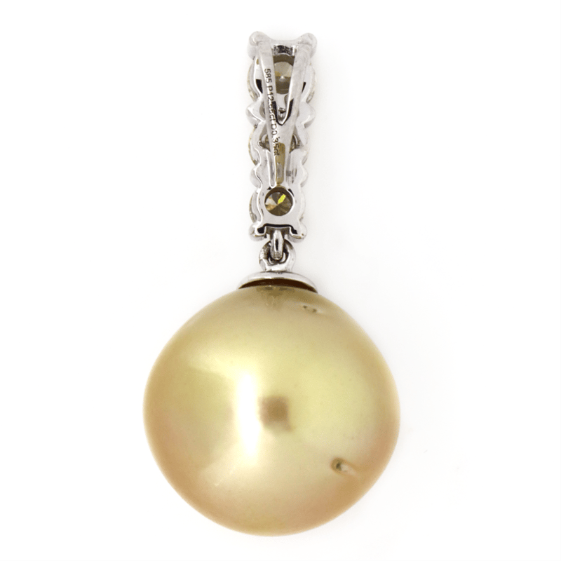 14K WHITE GOLD, GOLDEN CULTURED SOUTH SEA PEARL AND DIAMOND, DROP PENDANT.