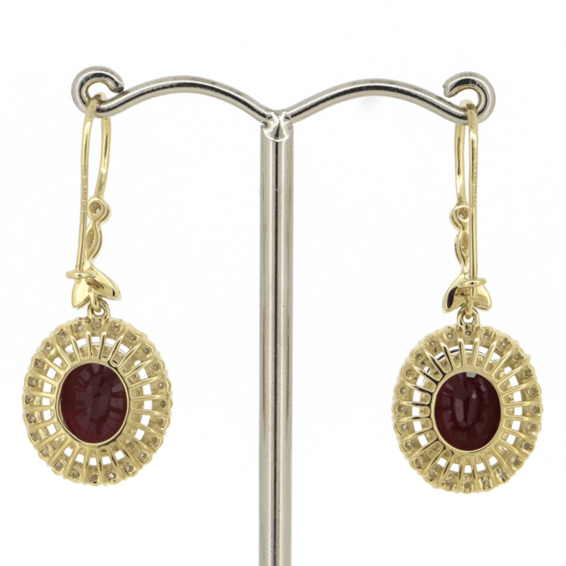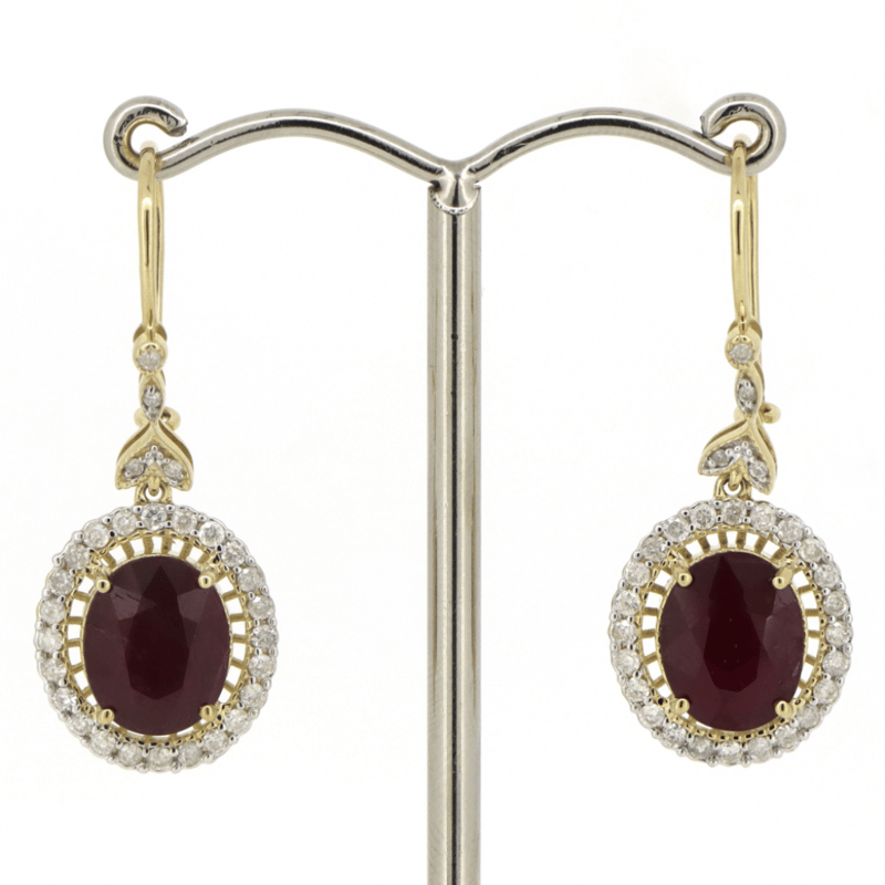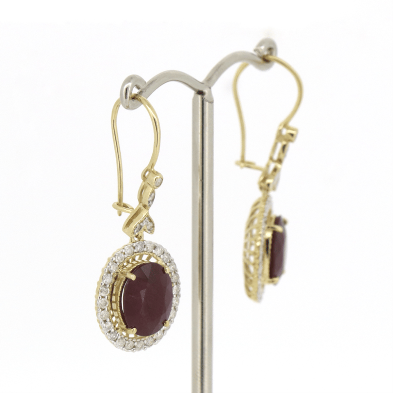 14K YELLOW GOLD, RUBY AND DIAMOND, VINTAGE INSPIRED DROP EARRINGS.