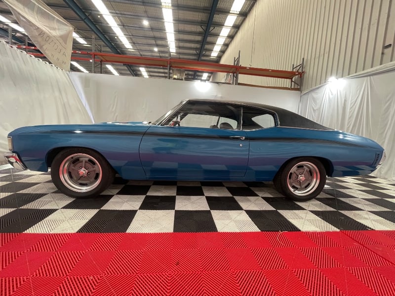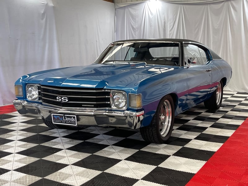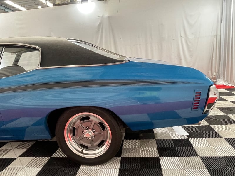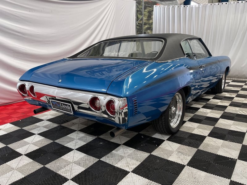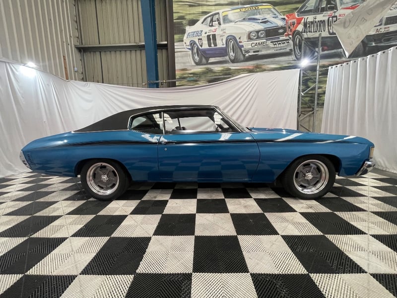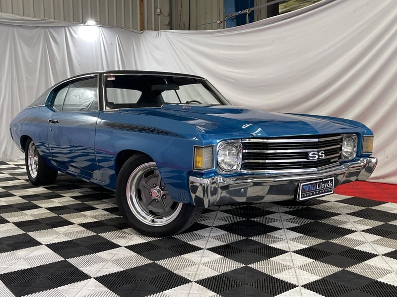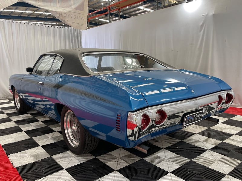 1972 Chevrolet Chevelle Malibu two‑door coupe finished in Blue. Left‑hand drive configuration with rear‑wheel drive, powered by a 402ci V8 petrol engine paired with an automatic transmission. Odometer indicating 91,768 kilometres. Seating for four occupants.