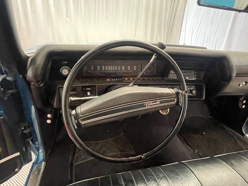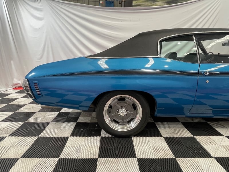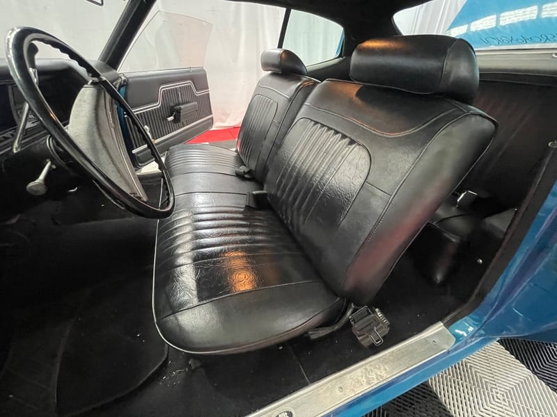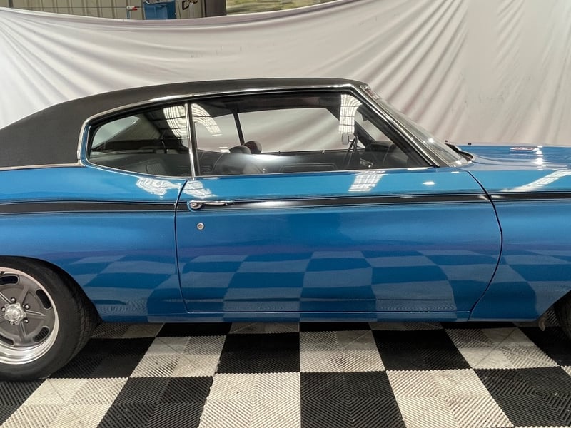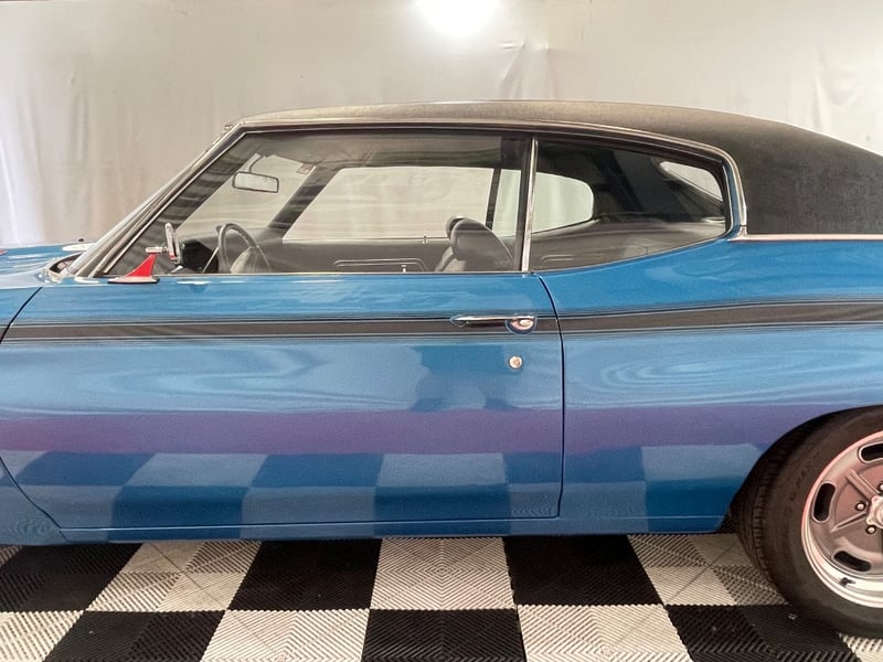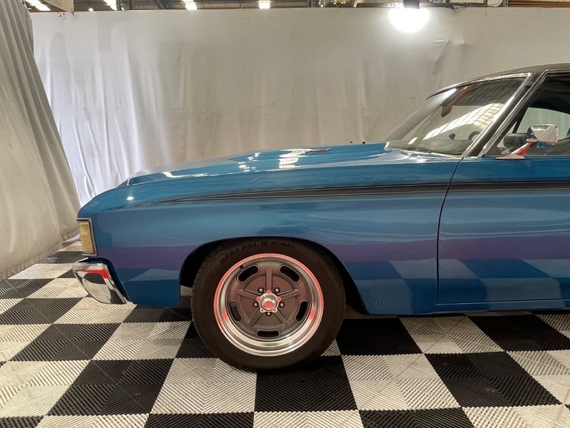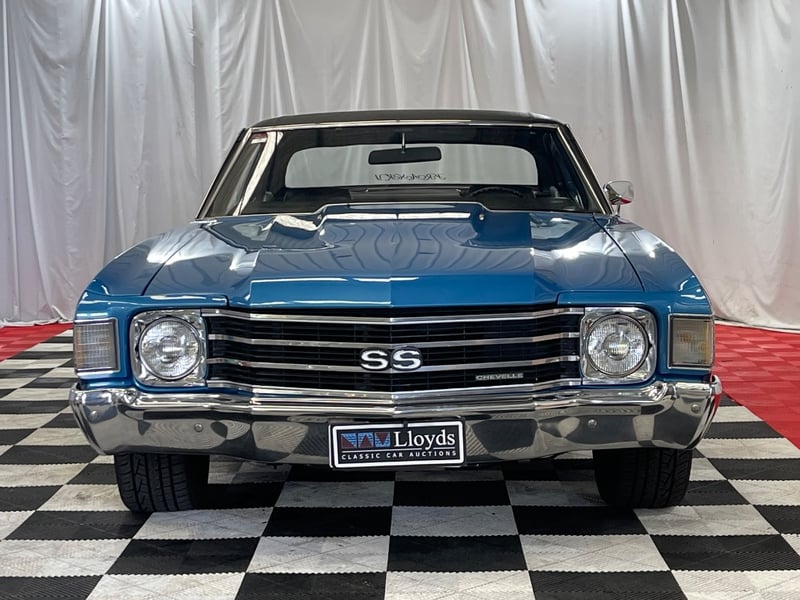 1972 Chevrolet Chevelle Malibu two‑door coupe finished in Blue. Left‑hand drive configuration with rear‑wheel drive, powered by a 402ci V8 petrol engine paired with an automatic transmission. Odometer indicating 91,768 kilometres. Seating for four occupants.