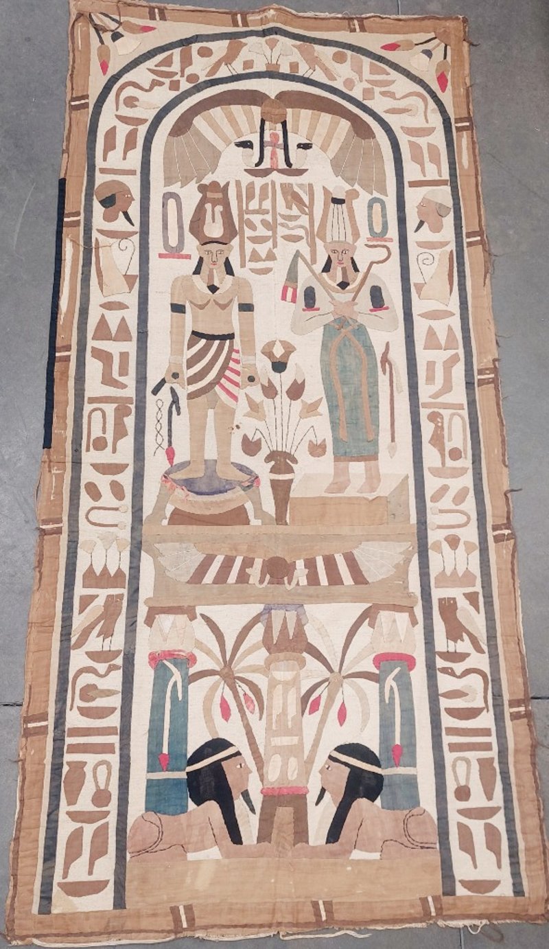 EGYPTIAN REVIVAL APPLIQUÉ TEXTILE WALL HANGING.