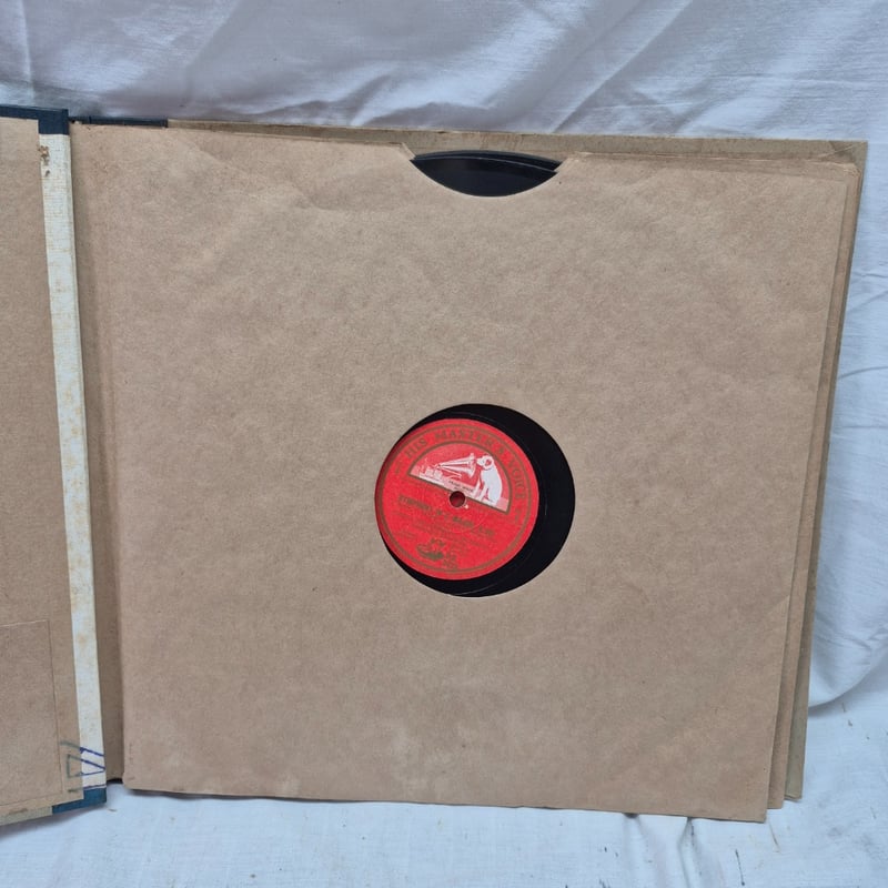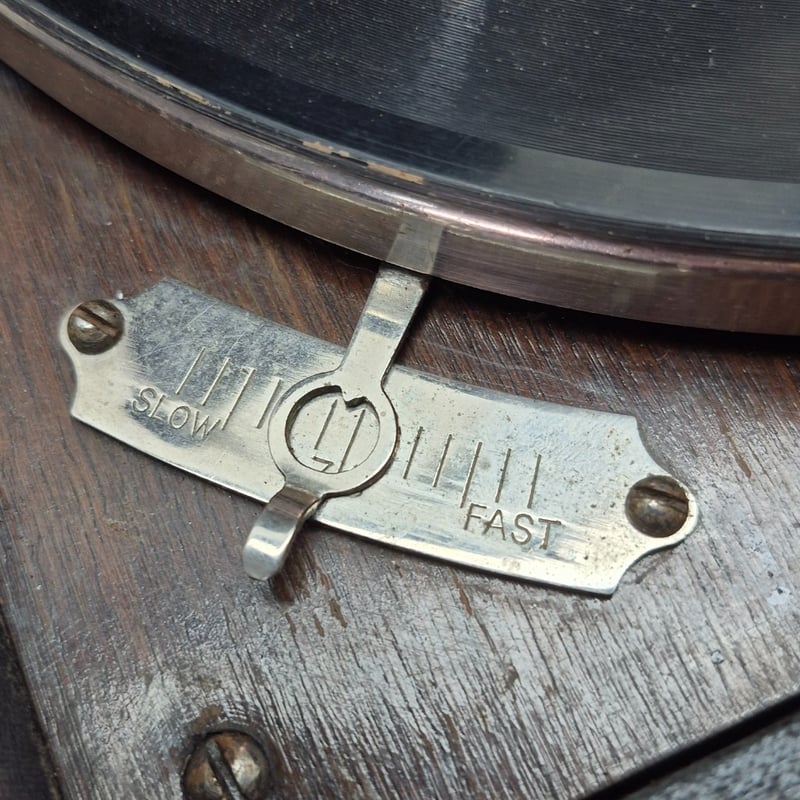 Portable Wind-Up Gramophone Featuring A Dark Brown Leather-Bound Carrying Case With Brass Corner Reinforcements And Latches. The Unit Includes A Chrome Tonearm With Replaceable Needle, Black Turntable Platter, And Manual Speed Control (Marked "Slow/Fast"). Accompanied By Original Documentation And Instruction Booklet. Collection Includes Four His Master'S Voice 78Rpm
