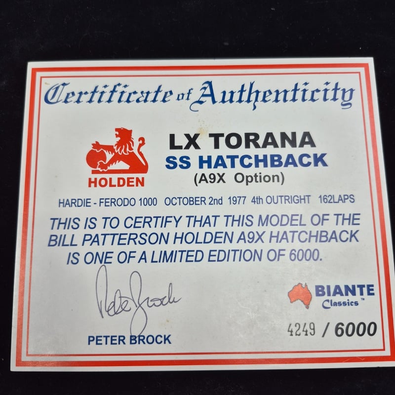 BIANTE HOLDEN LX TORANA APX SS HATCH PETER BROCK SIGNED AND CERT 1:18
