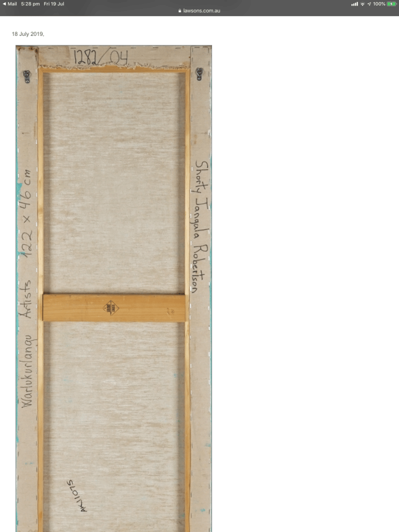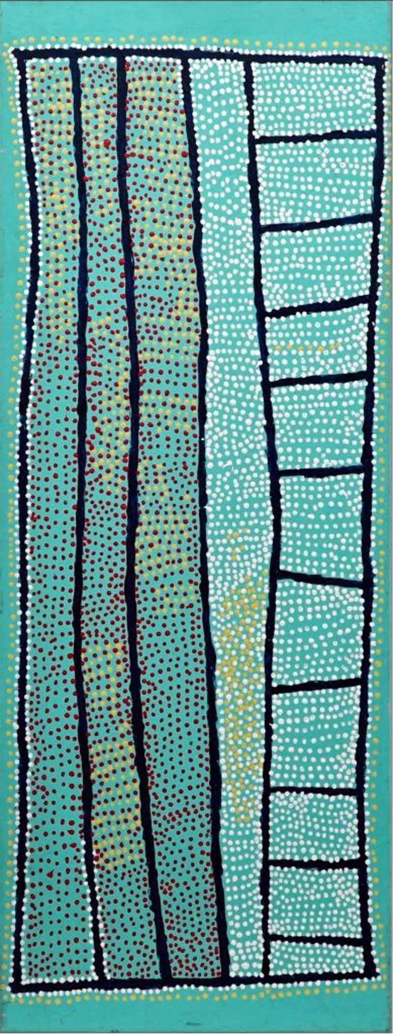 SHORTY ROBERTSON JANGALAOriginal Acrylic Painting On Linen Title: Water Dreaming Image Size: 122 x 46 Condition: Good - Refer Images Warlukulangu Artists Cat.No. Verso 1282.04. Ready To Hang.Shorty Jangala Robertson (C. 1930-2014) A Warlukurlangu Artist Was From Yuendumu In The Northern Territory. He Lived By Hunting And Gathering With His Extended Warlpiri Family; Separated From His Mother During The War, He Was Reunited With Her When She Walked Hundreds Of Miles On Foot To Bring Him Back To His Birthplace Northwest Of Yuendumu. After Working For Various Enterprises In The Area Around His Birthplace He Settled In Yuendumu In 1967. He Did Not Paint Until Late In His Life, But Soon After Became A Member Of The Warlukurlangu Cooperative. His Widow, Lady Nungarrayi Robertson, Is Also An Artist. After A Single Group Exhibition At The Gabrielle Pizzi Gallery In 2002 He Held His First Solo Show In November 2003 At Melbourne'S Alcaston Gallery. His Work Is Represented In State And National Collections Including Agnsw, Nga And Ngv. 584458+282