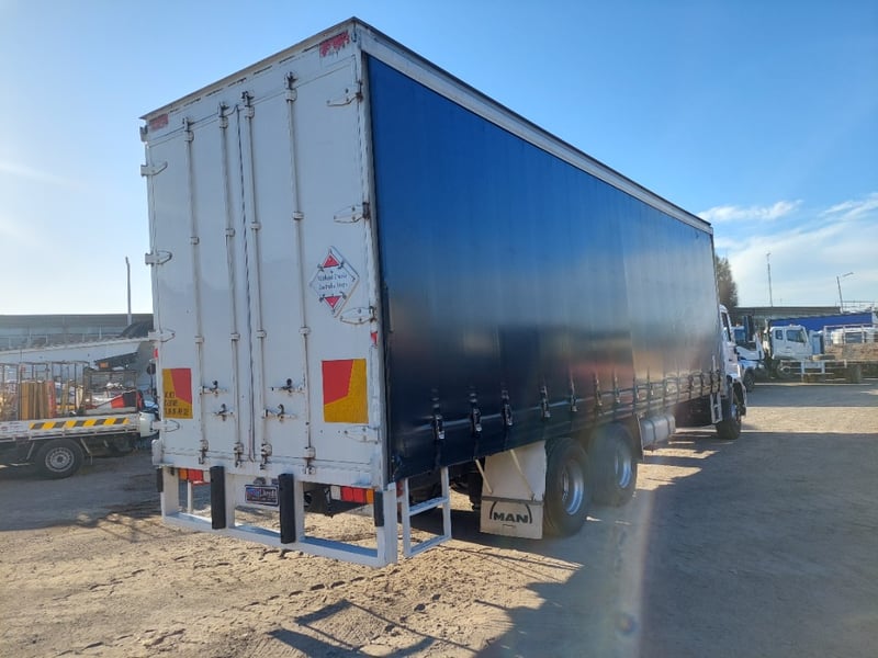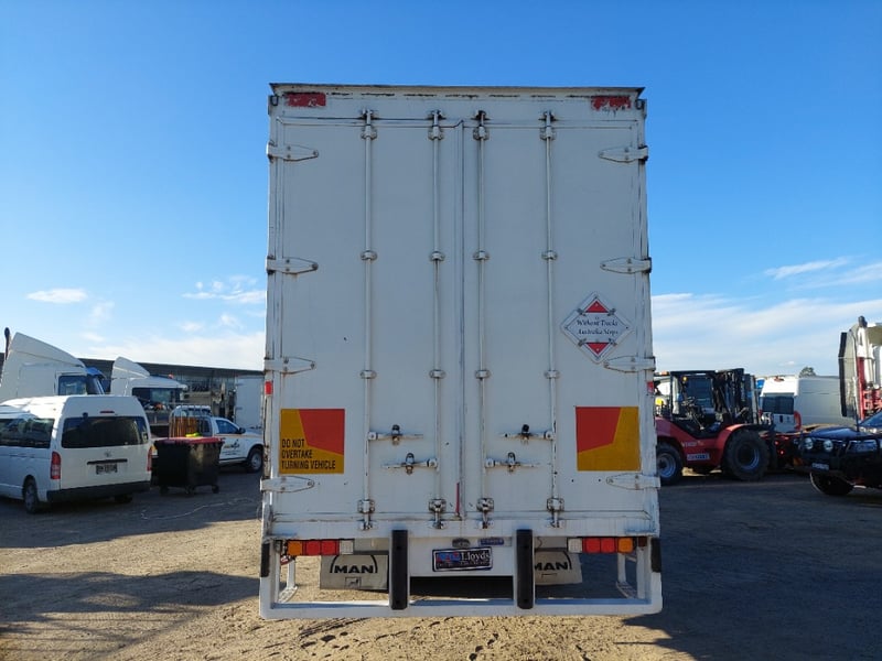 Notes: 2006 man tautliner, new load restraint curtains, full hanging gates, aircon, tints, full adjustable rear air bag suspensions. 14 pallet jumbo body.