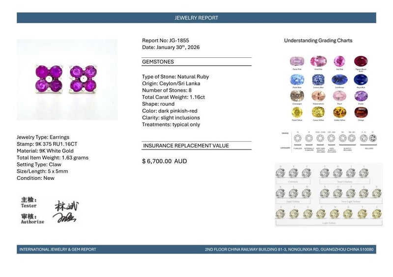 9CT WHITE GOLD CEYLON RUBY FLORAL STUD EARRINGS Featuring, 8 Round Cut, Dark Pinkish-Red Ceylon Rubies (1.16Ct Tsw, Slight Inclusions), Claw Set. Valuations Provided by an Independent Third-Party Professional Not Directly Associated With Lloyds Auctions at AUD $6700This valuation has been conducted by an independent third-party professional. The valuation amount is an assessment by the issuing valuer and does not reflect the auction value of the item. Any inquiries regarding the valuation should be directed to the issuing valuer (refer to contact details on the certificate), as Lloyds Auctions has no affiliation or influence over the valuation, the valuer, or the stated amount. Condition: Good - Refer Images 0584524+2112