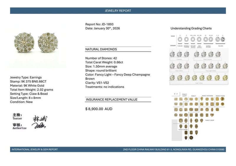 9CT WHITE GOLD FANCY CHAMPAGNE BROWN DIAMOND HALO STUD EARRINGS Featuring, 42 Round Brilliant Cut, Fancy Light-Fancy Deep Champagne Brown Diamonds (0.66Ct Tdw, Vs1-Vs2 Clarity), Claw/Bead Set. Valuations Provided by an Independent Third-Party Professional Not Directly Associated With Lloyds Auctions at AUD $8900This valuation has been conducted by an independent third-party professional. The valuation amount is an assessment by the issuing valuer and does not reflect the auction value of the item. Any inquiries regarding the valuation should be directed to the issuing valuer (refer to contact details on the certificate), as Lloyds Auctions has no affiliation or influence over the valuation, the valuer, or the stated amount. Condition: Good - Refer Images 0584524+2113