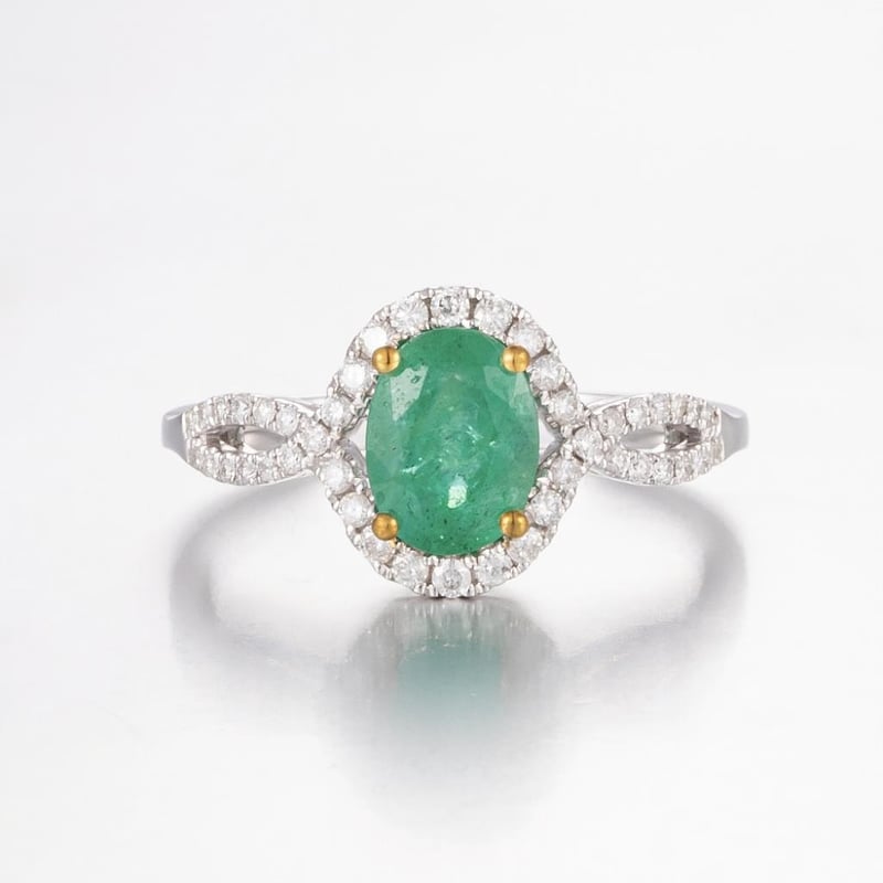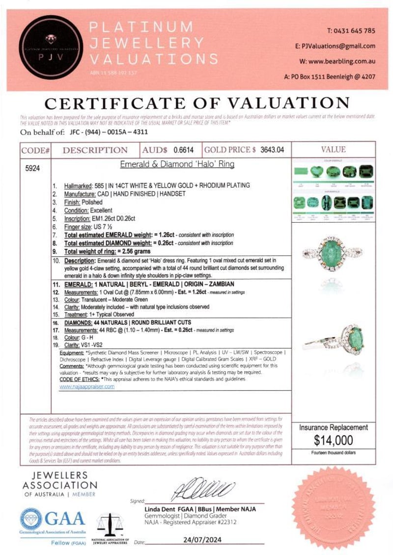 14CT WHITE GOLD ZAMBIAN EMERALD AND DIAMOND HALO RING Featuring Centre, One Oval Cut, Moderate Green Zambian Emerald (1.26Ct, Moderately Included), Bead Set In Yellow Gold, With 44 Round Brilliant Cut Diamonds (0.26Ct Tdw, G-H Colour, Vs1-Vs2 Clarity), Bead Set. Ring Size O. Valuations Provided by an Independent Third-Party Professional Not Directly Associated With Lloyds Auctions at AUD $14000This valuation has been conducted by an independent third-party professional. The valuation amount is an assessment by the issuing valuer and does not reflect the auction value of the item. Any inquiries regarding the valuation should be directed to the issuing valuer (refer to contact details on the certificate), as Lloyds Auctions has no affiliation or influence over the valuation, the valuer, or the stated amount. Condition: Good - Refer Images 0584524+2114