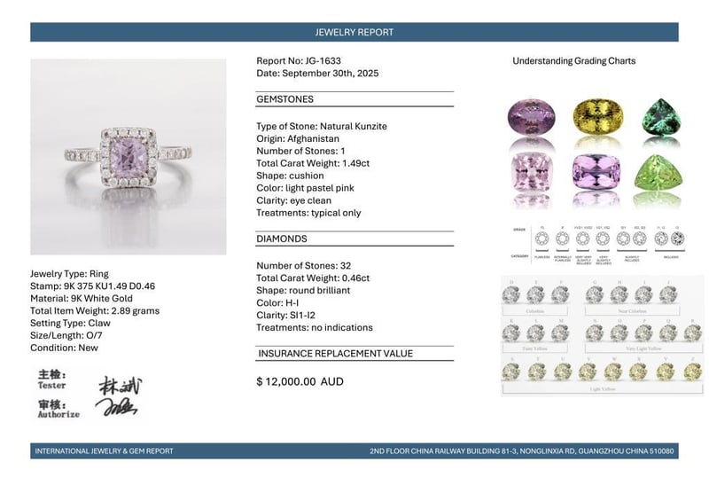 9CT WHITE GOLD AFGHAN KUNZITE AND DIAMOND HALO RING Featuring Centre, One Cushion Cut, Light Pastel Pink Afghan Kunzite (1.49Ct, Eye Clean), Claw Set, With 32 Round Brilliant Cut Diamonds (0.46Ct Tdw, H-I Colour, Si1-I2 Clarity), Claw Set. Ring Size O. Valuations Provided by an Independent Third-Party Professional Not Directly Associated With Lloyds Auctions at AUD $12000This valuation has been conducted by an independent third-party professional. The valuation amount is an assessment by the issuing valuer and does not reflect the auction value of the item. Any inquiries regarding the valuation should be directed to the issuing valuer (refer to contact details on the certificate), as Lloyds Auctions has no affiliation or influence over the valuation, the valuer, or the stated amount. Condition: Good - Refer Images 0584524+2119