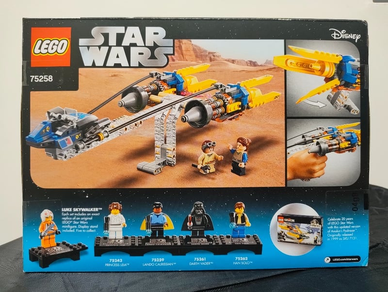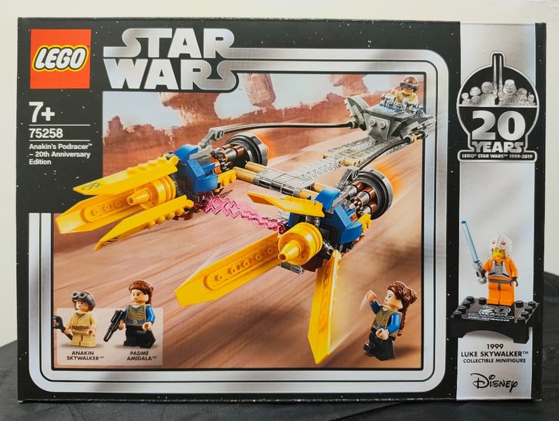 Lego Star Wars Set 75258 Featuring Anakin'S Podracer In 20Th Anniversary Edition Packaging. Includes Yellow And Blue Podracer With Dual Engines, Minifigures (Anakin Skywalker, Padmé Amidala), And Collectible 1999 Luke Skywalker Minifigure. Original Retail Set Celebrating Two Decades Of Lego Star Wars (1999-2019). Vintage-Inspired Box Design With Classic 1999 Aesthetic And Detailed Imagery Of Tatooine Landscape.