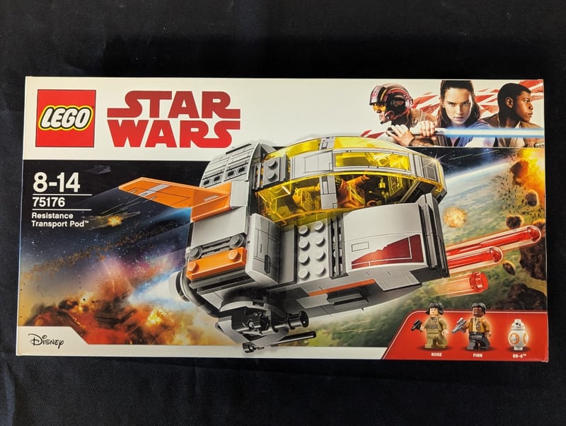 Lego Star Wars Set 75176 Featuring The Resistance Transport Pod From The Force Awakens. This Buildable Spacecraft Includes Opening Cockpit, Rotating Rear Engines, Pop-Out Laser Cannons, And Detachable Landing Gear. The Set Comprises Minifigures Of Poe Dameron, Finn, And Bb-8 Droid. Designed For Ages 8-14 With Multiple Construction And Play Features. Original Factory-Sealed Packaging With Complete Visual Assembly References.