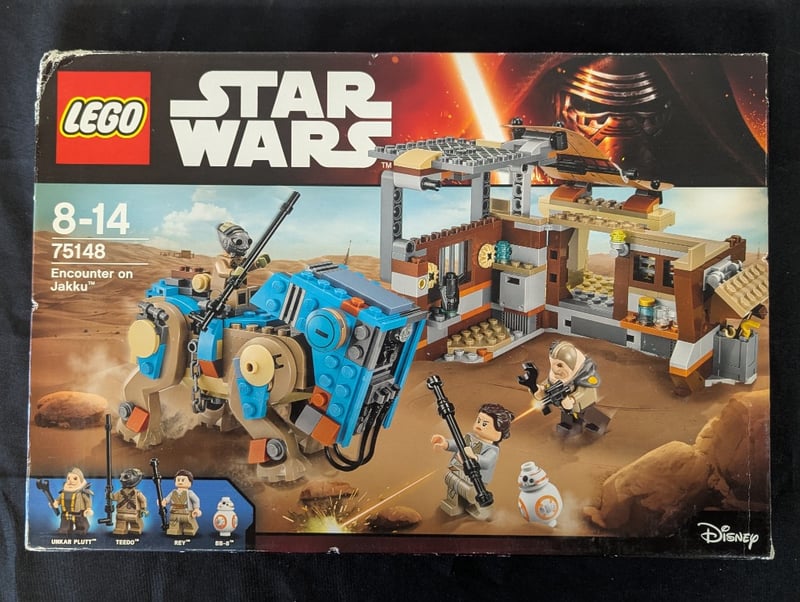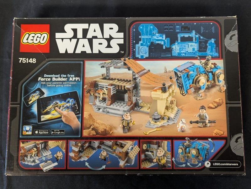 Lego Star Wars Set 75148 "Encounter On Jakku" Featuring A Buildable Blue Speeder Vehicle, Detailed Desert Outpost Structure With Modular Sections, Minifigures Including Finn, Rey, And Bb-8 Droid, Plus Additional Character Figures. Includes Force Builder App Compatibility. Original Sealed Packaging With Minimal Wear To Box Edges.