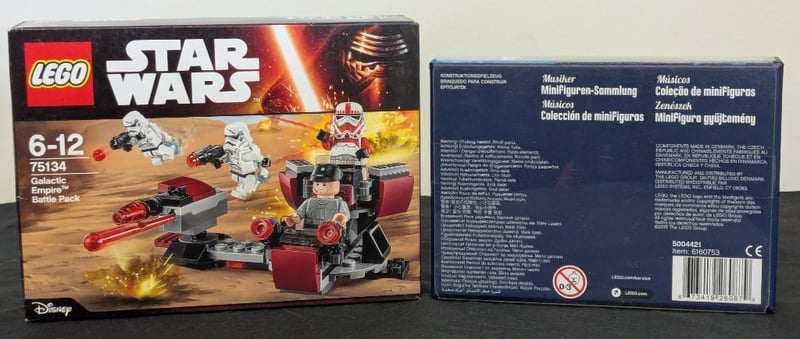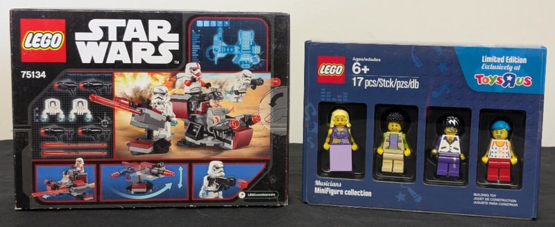 Vintage Lego Star Wars Set 75134 Featuring The Galactic Empire Battle Pack (6-12 Years) With Stormtrooper Minifigures And Buildable Combat Vehicle. Accompanied By Exclusive Toys"R"Us Limited Edition Musician Minifigure Collection (4 Pieces). Original Packaging Intact With Vintage Graphic Design And Multi-Language Instructions Visible On Reverse. Complete With All Essential Components And Minimal Wear Consistent With Collectible Condition.