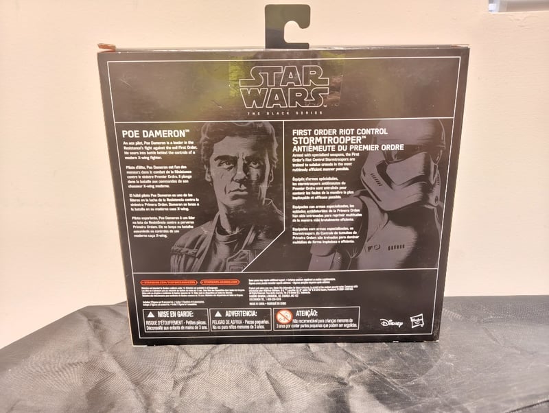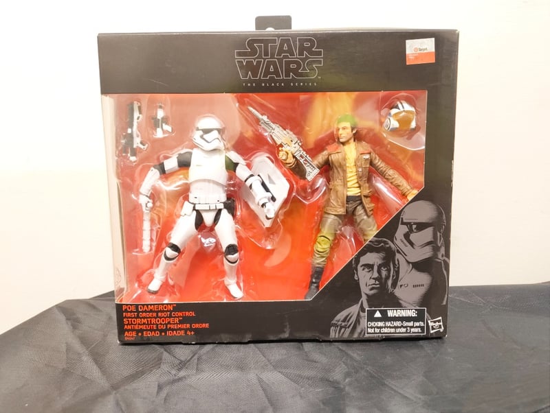 Star Wars The Black Series Two-Pack Featuring Poe Dameron In Tan/Orange Pilot Suit With Blaster Accessories And First Order Riot Control Stormtrooper In White Armor With Helmet And Riot Control Staff. Mint Condition In Original Sealed Packaging With Character Artwork And Multilingual Descriptions On Outer Box.