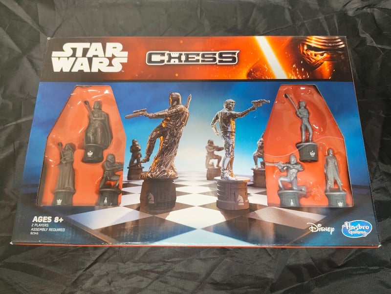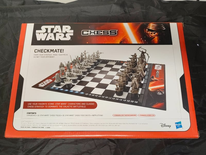 STAR WARS CHESS SET BY HASBRO GAMING - COMPLETE WITH BOARD AND PIECESOfficial Star Wars Chess Set Featuring Iconic Characters As Game Pieces. Includes Decorative Chesboard With Star Wars Branding, 32 Detailed Character Pieces Representing Light And Dark Sides, And Instruction Manual. Licensed Disney/Hasbro Gaming Product. Ages 8+. Two-Player Strategy Game Combining Classic Chess Mechanics With Star Wars Universe Characters And Galactic-Themed Battlefield Design.Condition: Good - Refer To Images584522+287
