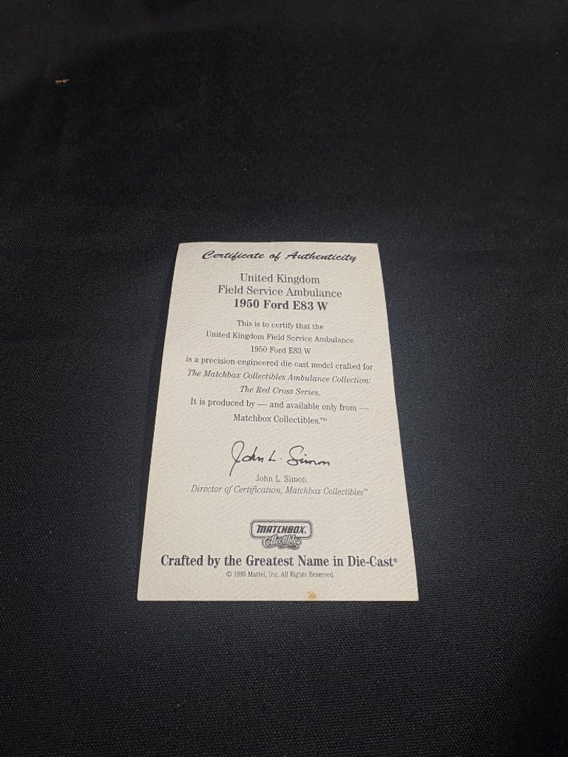 MATCHBOX COLLECTIBLES 1950 FORD E83W FIELD SERVICE AMBULANCE DIE-CAST MODEL WITH CERTIFICATE OF AUTHENTICITY