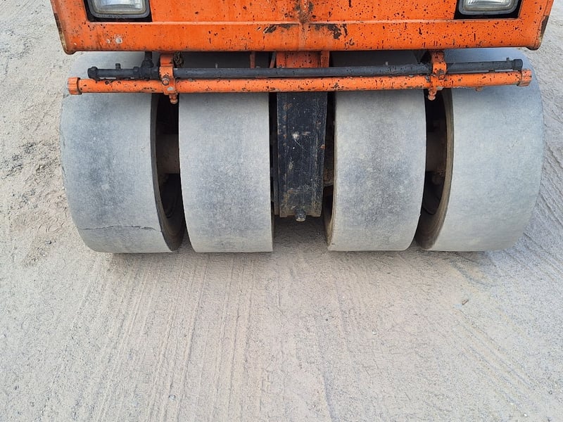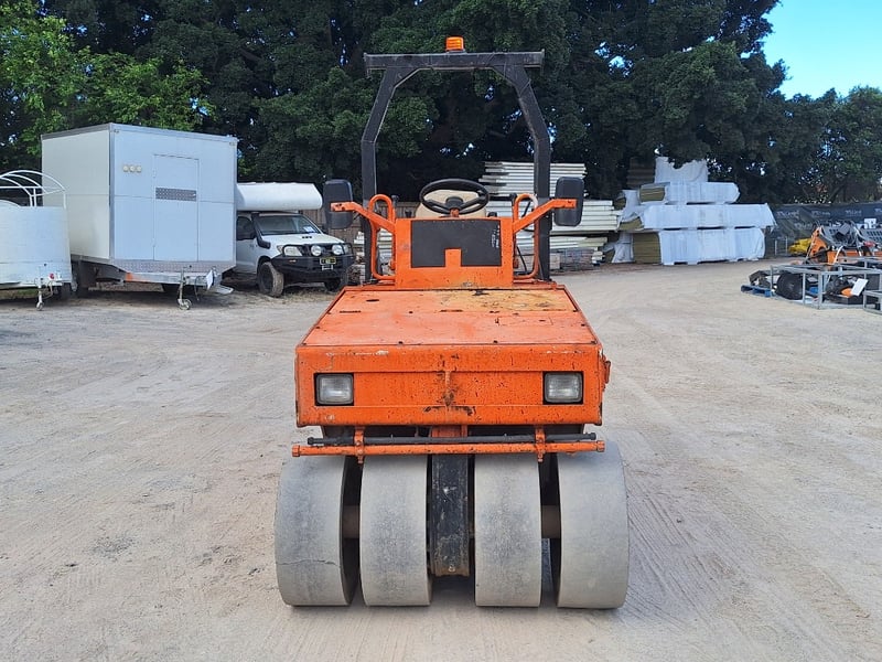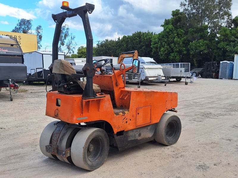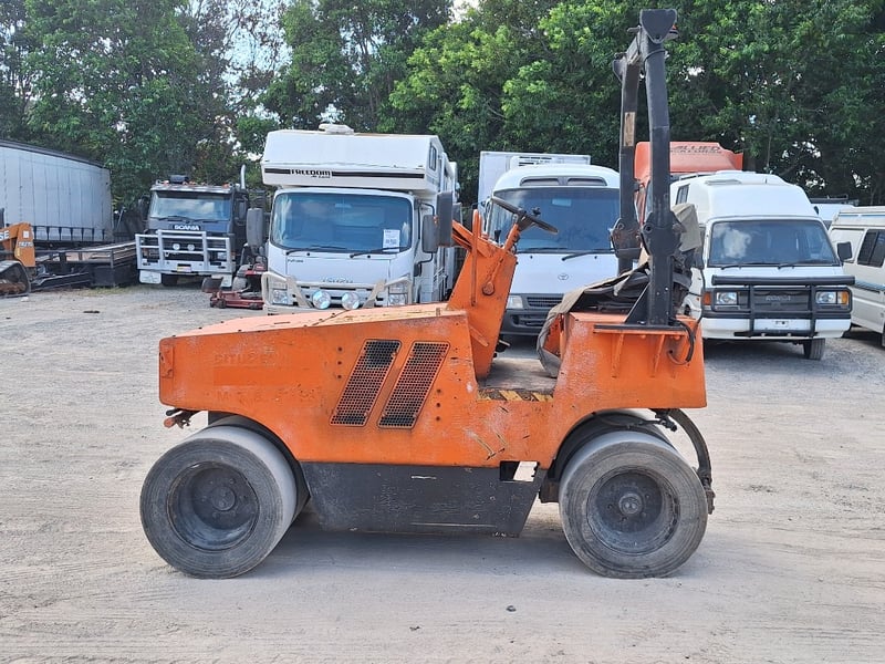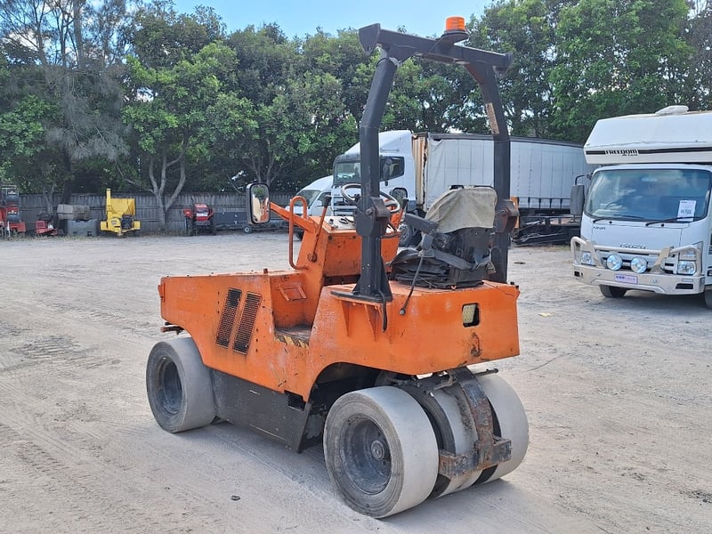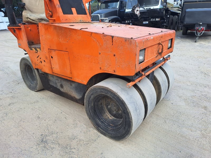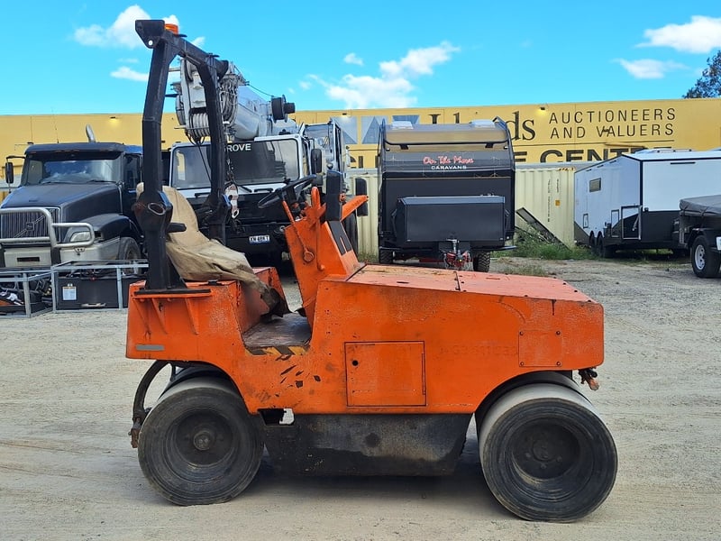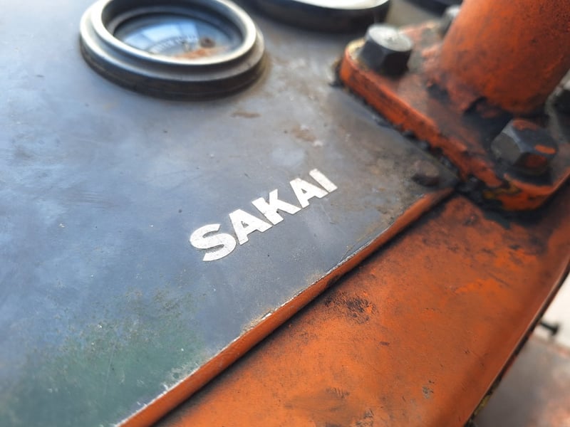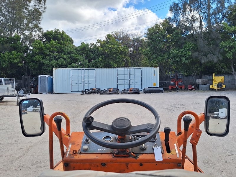 Description/extras: Sakai Pneumatic Tyre Roller, 4 x Front Solid Wheels, 3 x Rear Solid Wheels, Rear Steer, Forward And Reverse, Amber Light, ROPS. Worn seat cover, weathered paint finish, surface corrosion on metal components, worn cabin upholstery, minor dents on body panels, aged rubber seals.